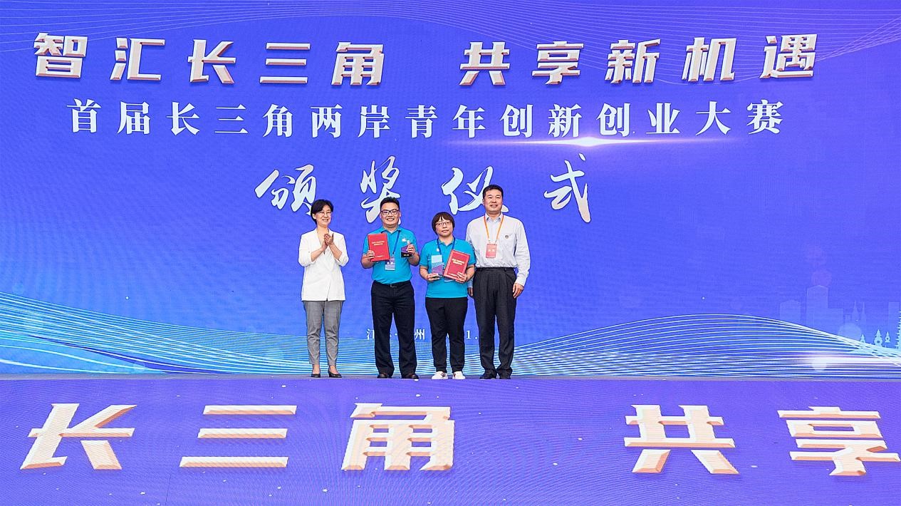公司博士生邱奕翔获颁大赛一等奖(左二),江苏省台办主任练月琴(左一)、国台办经济局副局长袁野(右一)颁奖