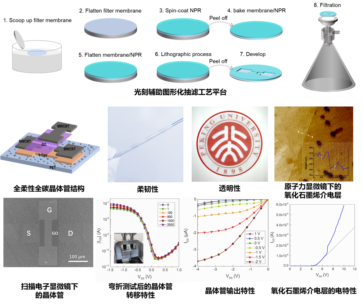 近期,公司张敏副教授课题组提出了一种光刻辅助图形化抽滤(Photolithography Incorporated Filtration, PIF)的设计和工艺方法来解决低维柔性材料集成的问题,并采用该方法实现了全柔性全碳薄膜晶体管。该研究使用半导体碳纳米管作为有源沟道,金属碳纳米管作为源漏栅电极,氧化石墨烯(GO)作为介电层,以聚对苯二甲酸乙二酯滤膜为基底,通过四步PIF工艺,在室温条件下得到电特性、柔韧性、透明性兼备的高性能全柔性薄膜晶体管阵列。其工作电压低至-1 V,亚阈值摆幅低至170 mV/dec,场效应迁移率高达105 cm2/Vs。该器件在1 mm的超小曲率半径下弯折2000次,性能总体保持稳定。器件整体(包括衬底)表现出76%的光透射率。如果去除衬底影响,晶体管本身具有94%的光透射率和小于100 nm的超薄厚度。该器件同时满足了柔性电子对高驱动能力、低工作电压、超轻、超薄、超柔、高透明的要求。此外,所提出的光刻辅助图形化抽滤为低温集成工艺平台,为未来高性能柔性可拉伸电子器件和应用集成的发展提供了可行的解决方案。