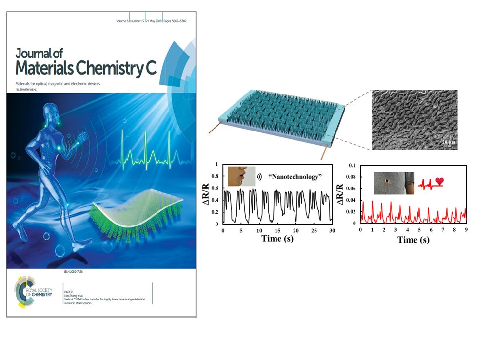 相关研究成果以《Vertical CNT-EcoflexNanofins for Highly Linear Broad-Range-Detection Wearable Strain Sensors》(《基于竖直碳纳米管-Ecoflex纳米鳍的高线性宽检测范围可穿戴应力传感器》)为题,于2018年5月发表于领域内重要期刊Journal of Materials Chemistry C《材料化学期刊 C》上(DOI: 10.1039/c7tc05571d),并被选为内封面(inside front cover)刊出。WilliamHill中文官网入口2015级硕士研究生张硕为第一作者,张敏老师为通讯作者。上述研究工作得到了深圳市科技研发资金基础研究自然探索项目,国家自然科学基金等支持。