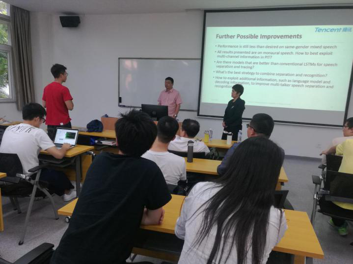 最后,俞栋博士对语音分离问题作了总结和展望。同学们纷纷就自己感兴趣的问题对俞栋博士请教,俞老师也作了详细的回复和讲解。之后,嘉宾和部分同学与俞栋博士合影留念。这次讲座中,俞栋老师没有回避在问题研究上的失败与不足,而是从每次失败中找到原因、发现问题,并针对性地去解决它。这段宝贵经验鼓励并启发了在座的同学们,要勇于尝试、开拓创新,即使失败的尝试也有非凡的意义。