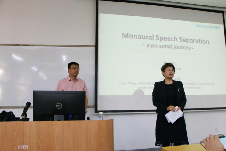 2017年11月1日下午16点,应邹月娴教授邀请,腾讯AI Lab副主任俞栋博士来公司访问交流,在C栋103教室发表了主题为“Monaural Speech Separation – a Personal Journey”的学术讲座,同学们均以极大的热情欢迎俞栋博士的到来。讲座由邹月娴教授主持,参加讲座的有来自WilliamHill中文官网入口的朱跃生教授、焦海龙副教授、WilliamHill中文官网入口的硕士生、博士生和其他来宾。