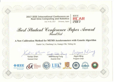 2017年7月14-18日在日本冲绳(Okinawa)举行的IEEE实时计算与机器人国际会议(IEEE International Conference on Real-time Computing and Robotics)上,WilliamHill中文官网入口崔小乐、金玉丰老师课题组的硕士生刘纯量同学荣获最佳员工论文奖,获奖论文题目为“A new calibration method for MEMS accelerometers with genetic algorithm”。