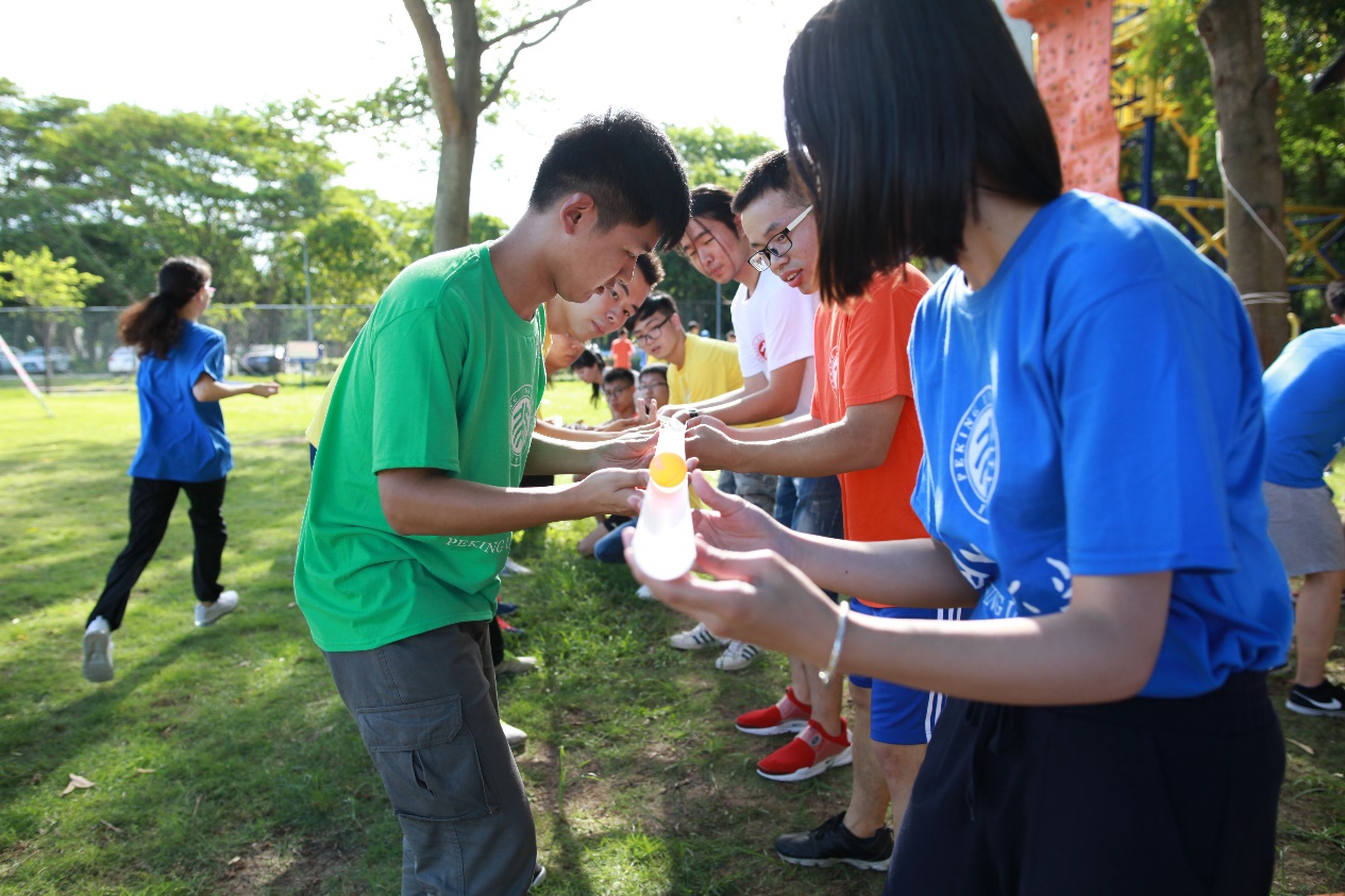本次户外拓展由营员破冰、能量传输、尖峰时刻三个部分组成。为活跃现场气氛,覃老师首先让前后排同学开展握手、捏耳朵等游戏,营员也在游戏中也迅速放开。随后覃老师将大家分组并进行组内团建活动。