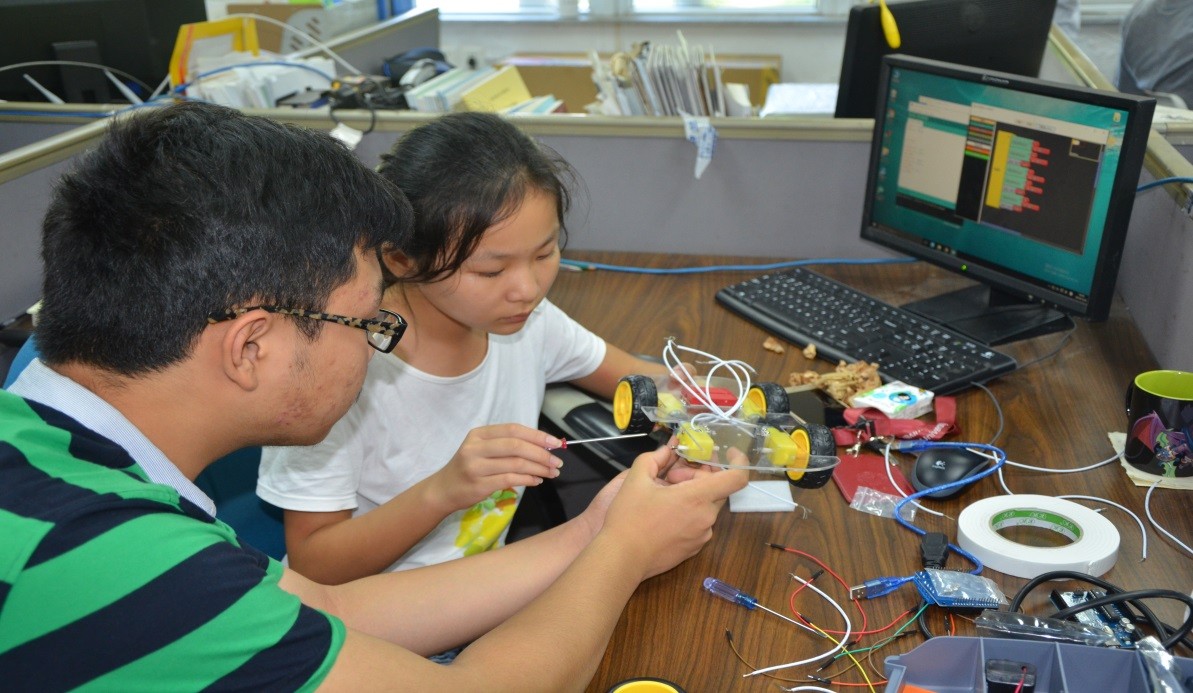 本次活动分为四个环节,第一个环节是进入奇妙的电子世界,让学员体验智能小车,并了解其中的电子元器件;第二个环节是成为小创客,让学员动手实践小车,并通过学习编码,让智能小车动起来;第三个环节是趣味比赛,学员可以根据自己的想法,自主实践小车,进行趣味比赛;第四环节是视野扩展,让学员发现更多的新奇创客项目,颁发结课证书。