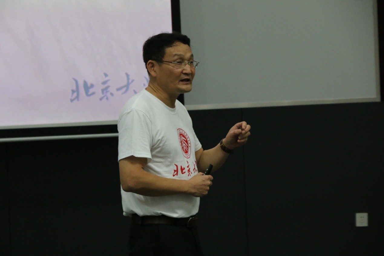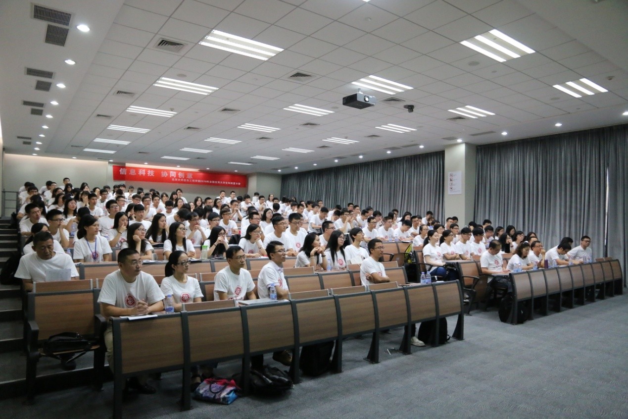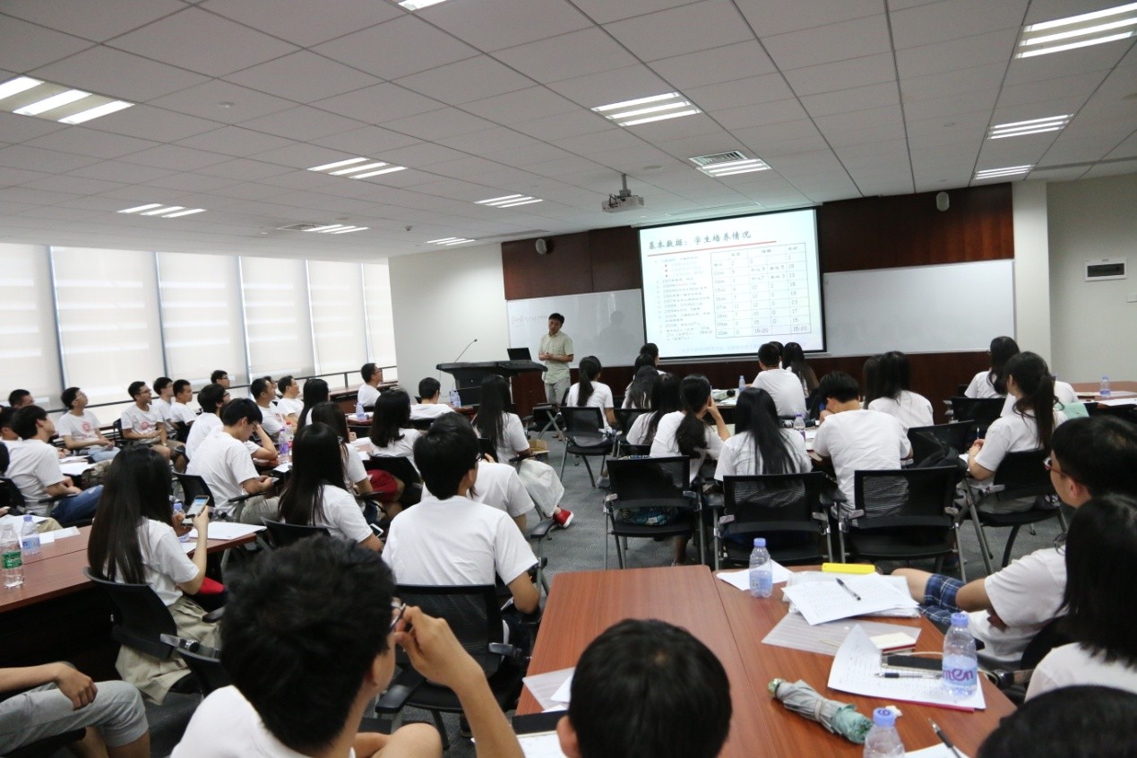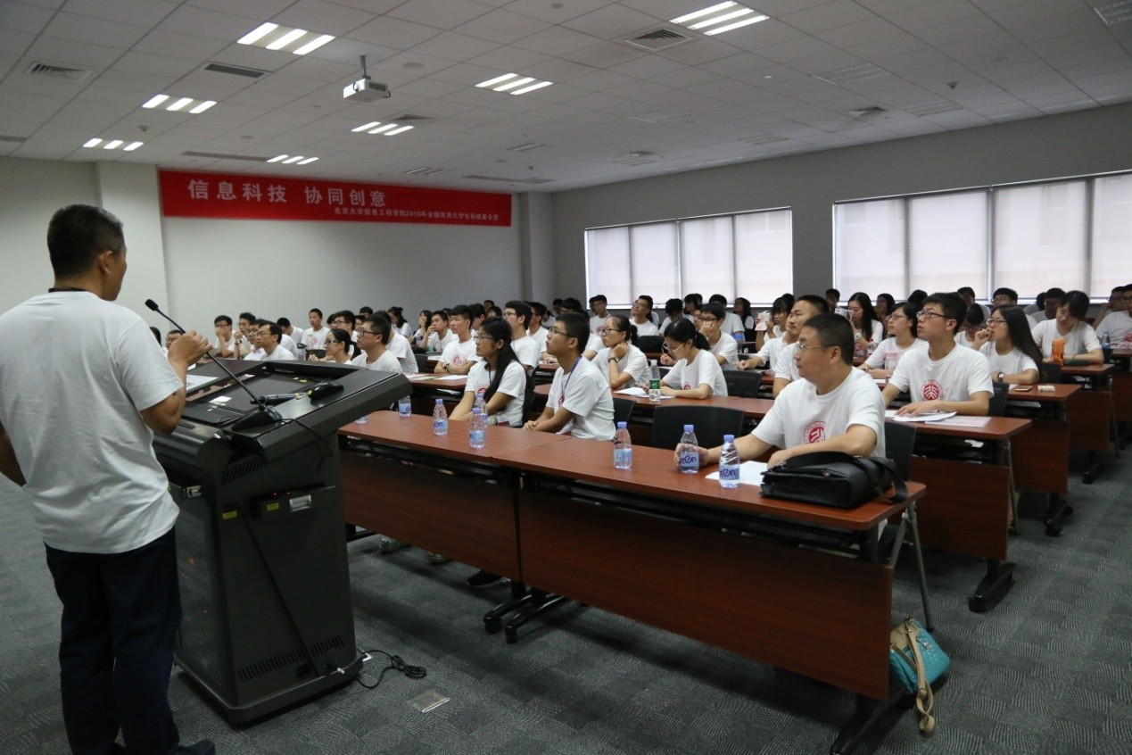 7月21日早上八点半在汇丰商公司519教室举行了开营仪式。 整个开营仪式由王荣刚老师主持,首先邀请了朱跃生老师致欢迎词以及进行公司情况介绍,紧接着由林信南老师介绍微电子专业,朱跃生老师介绍计算机专业。在营员对公司个专业有大致了解后,组织者先引导营员移步汇丰大楼一楼左侧楼梯拍大合照,然后再分别安排微电子专业和计算机专业的营员到不同的教室,听各专业老师对自己具体的研究方向进行详细的介绍。