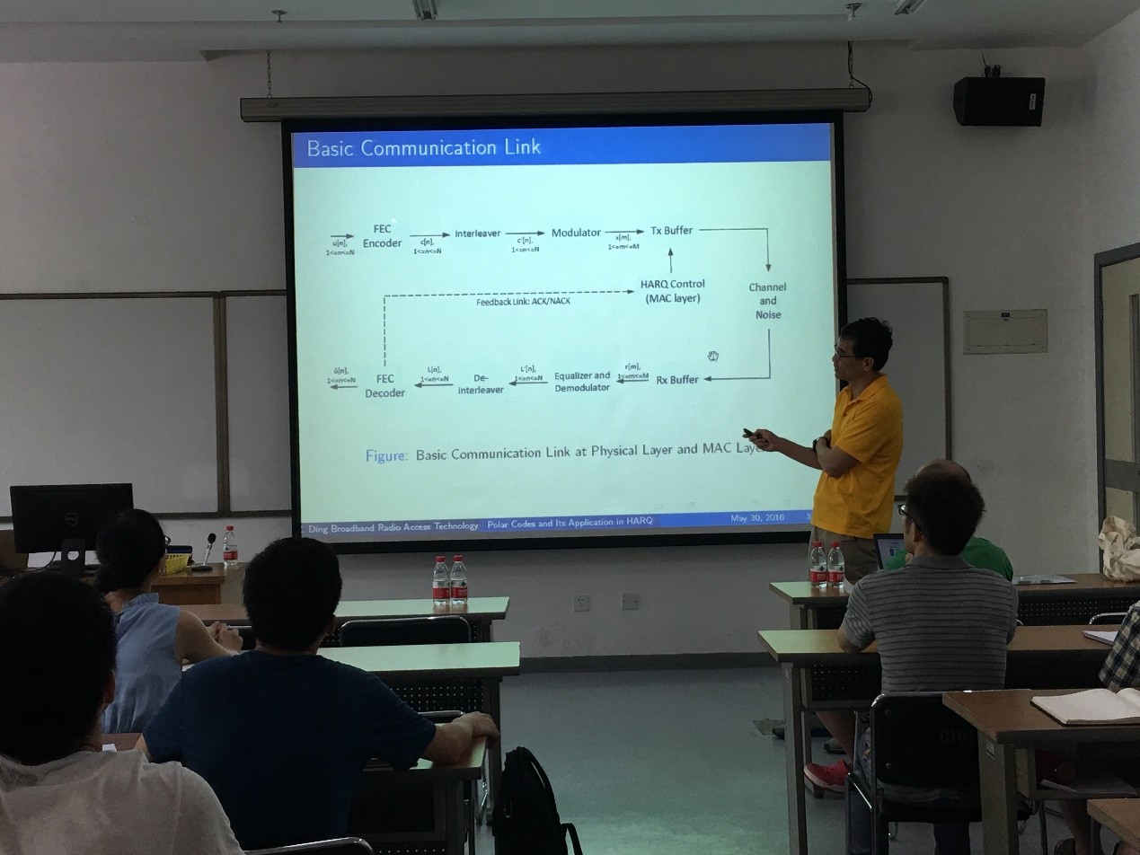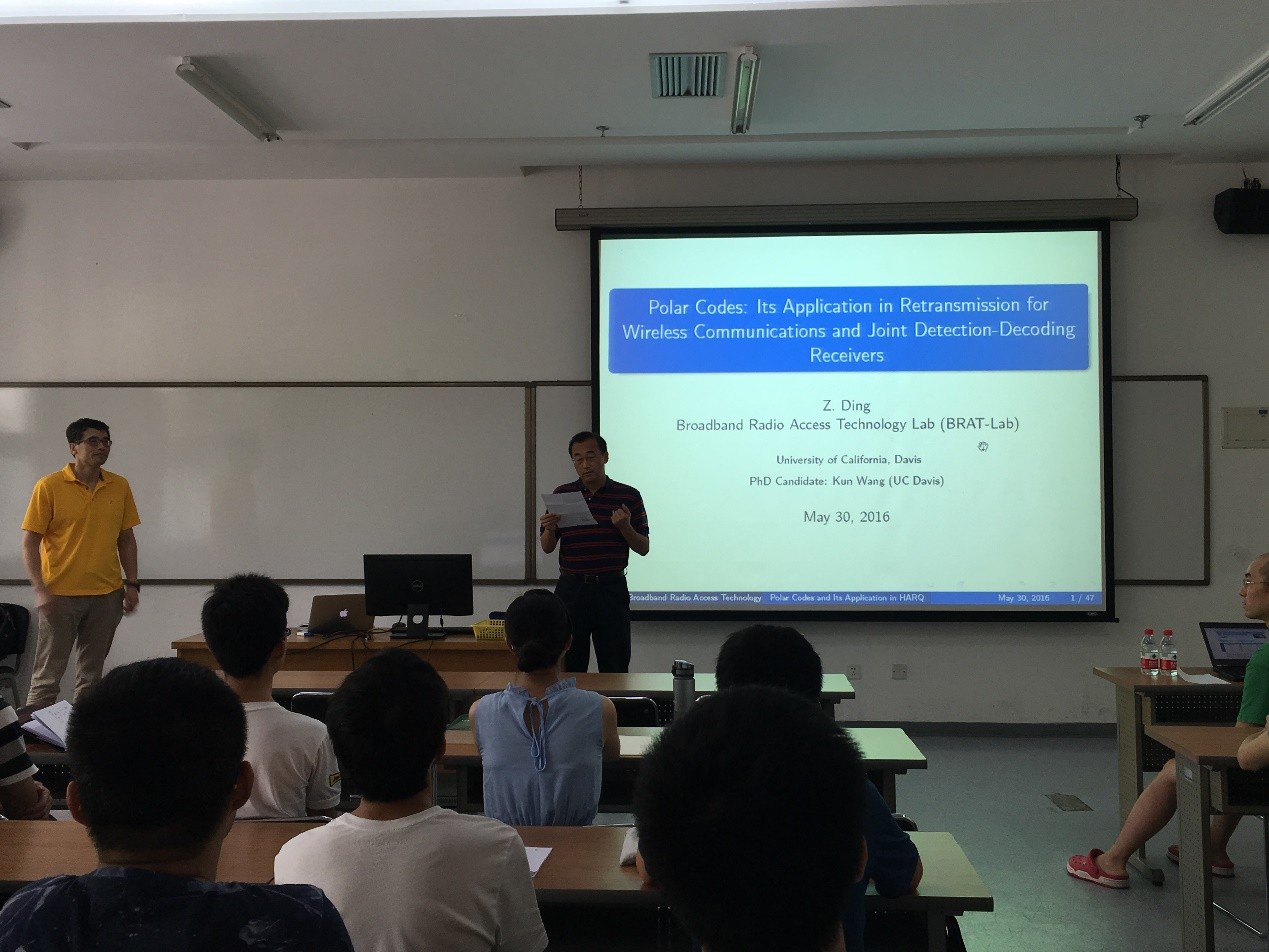 2016年5月31日,美国加州大学戴维斯分校丁峙教授应公司李革教授邀请,在C-102教室做了一场题为“Polar Codes: Its Application in Retransmission for Wireless Communications and Joints Detection-Decoding Receivers”的精彩报告,介绍了极化码在无线通信中的作用及无线通信中最新的接收机结构设计。公司师生积极与其进行学术讨论与交流,大家受益匪浅。