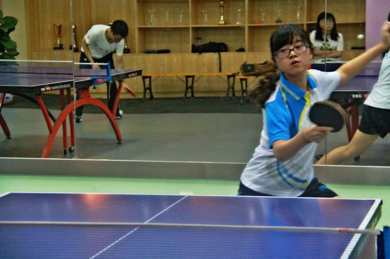 比赛开始后乒乓球馆内加油呐喊声此起彼伏,各个院的同学们都自愿组成啦啦队,为自己院系的参赛同学加油。赛场上,参赛的同学汗湿了衣襟,然而却未能模糊他们专注的视线。台桌上,小巧而灵动的乒乓球往来滑动,同学们的眼神也不禁随之而动,乒乒乓乓的声音像是应和人们紧张的心跳节奏,时时扣人心弦。