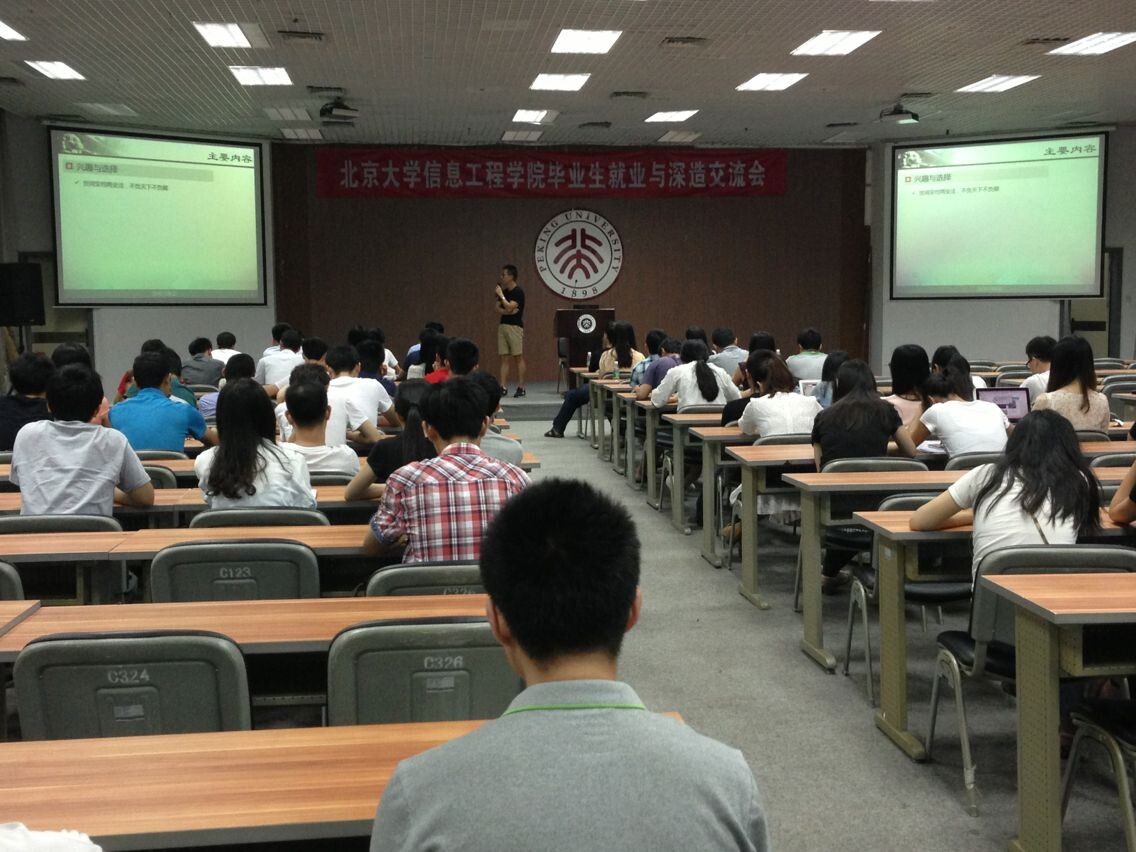 本次交流会由研会副主席肖宇翔同学主持,他首先感谢了公司对就业与深造经验交流工作的支持,也感谢了几位师兄的倾力加盟,之后宣布交流会正式开始。第一位进行经验介绍的是来自刘宏教授实验室的张结同学。张结同学有着丰富的博士申请经验,曾成功获得荷兰代尔夫特大学、英国帝国理工大学等攻读博士学位的机会,他主要为同学们介绍了留学所需要准备的材料,还与同学们分享了准备留学与公司选择时的心路历程,他最终选择到代尔夫特大学攻读博士学位。第二位进行经验介绍的是来自王新安教授实验室的杨乐同学。杨乐同学的演讲主题是“选择与就业”,他告诉我们一种选择决定一种生活,要遵循内心的声音。接下来演讲的是计算机专业的彭祎同学。彭祎同学的毕业去向是百度,他的演讲方式轻松幽默,让在场的同学获得了非常愉悦的听觉体验。随后,来自微电子专业的岳仑仑同学的毕业去向是华为,他以自己求职面试的亲身经历给大家提出了一些自己的求职小建议。第五位进行经验介绍的是来自计算机专业的陈艺勇同学。陈艺勇同学有着丰富的互联网公司求职经验,曾成功获得阿里巴巴、WAP、宜信等公司的入职机会,最终根据自己个人情况选择了宜信大数据方向的工作。接下来演讲的是微电子专业的杜虓同学,他的毕业去向是东方证券,他以自己的亲身经历告诉我们换专业并不难,我们信工的员工同样可以从事金融证券方面的工作。随后,来自计算机专业的李旭峰同学为大家讲述了自己应聘央行的经历,并分享了一些国企、央企、事业单位的求职经验。最后一位是来自张盛东教授实验室的谢磊同学,他从简历制作到面试笔试都为同学们做了细致的分析与经验分享。