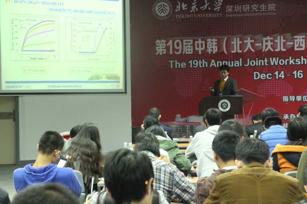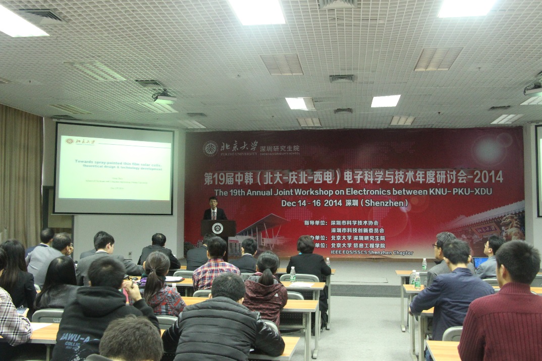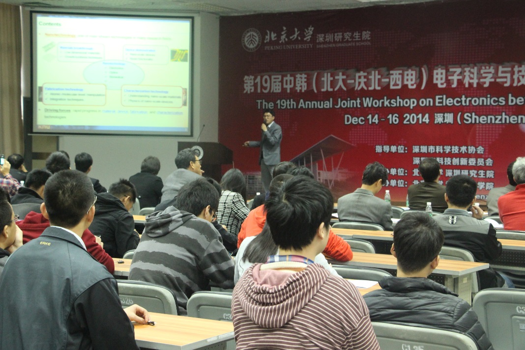 第十九届中韩(WilliamHill中文官网-韩国庆北大学-西安电子科技大学)微纳电子科学与技术年度研讨会于2014年12月15日-16日在WilliamHill中文官网深圳研究生院顺利召开。一年一度的中韩学术交流会议由三所大学轮流在北京、西安和韩国举办,这次是首次在深圳研究生院举办。来自三个公司的20多位教授以及WilliamHill中文官网入口的100多名研究生参加了研讨会。研讨会由WilliamHill中文官网入口张昭宇副教授主持,WilliamHill中文官网入口副经理张盛东教授致欢迎辞。来自三个公司的3位教授分别做了大会主题报告。庆北大学的Hongsik Park教授做了低维材料生长精准控制的专题报告,介绍了其研究小组在碳纳米管及石墨烯材料制备领域的研究思路和相关进展;西安电子科技大学的薛军帅博士做了其研究小组在III-V族化合物半导体器件研究方面的最新研究进展报告;最后,我WilliamHill中文官网入口的周航副教授报告了其小组在太阳能电池领域的最新研究成果。3位报告人的报告引起了参会人员的极大兴趣,互动环节的交流非常热烈。同时三校的参会人员还带来了20多篇学术论文,介绍了各自在微纳电子领域的最新研究进展和成果。大家以墙报的形式进行了充分的交流和深入的探讨。