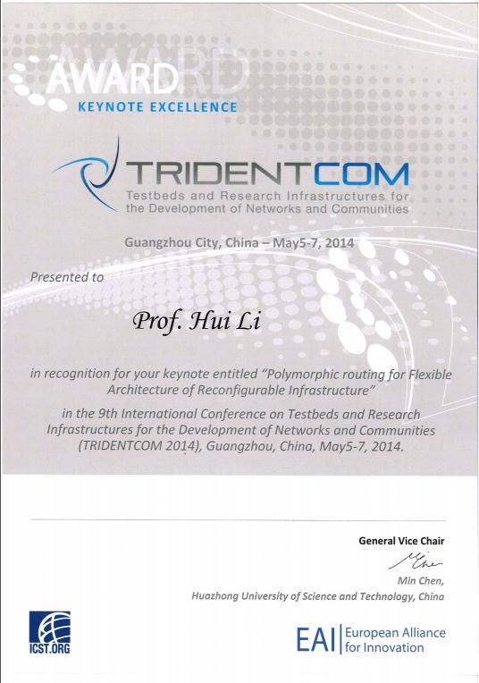 2014年5月5日上午,第9届网络测试床国际会议(International Conference on Testbeds and Research Infrastructures for the Development of Networks and Communities, TRIDENTCOM)在广州莱福广武酒店隆重召开。