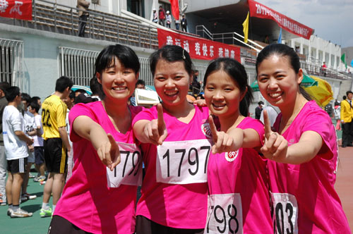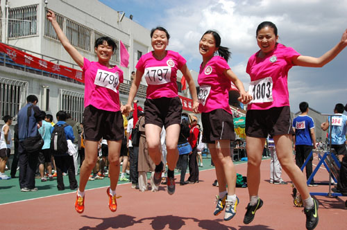 彭玲娟,陈蕾,陈颖,孙慧洁在100接力赛获得第一名后的欢呼