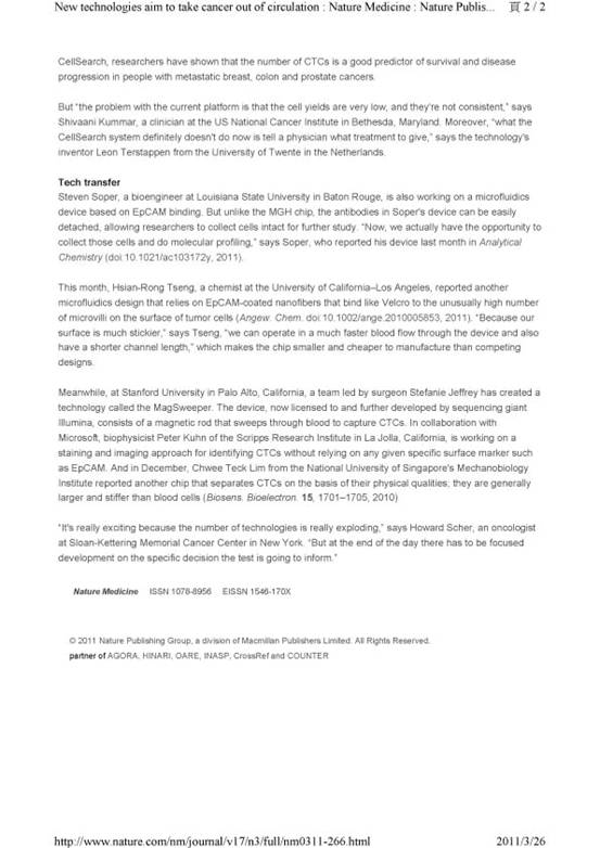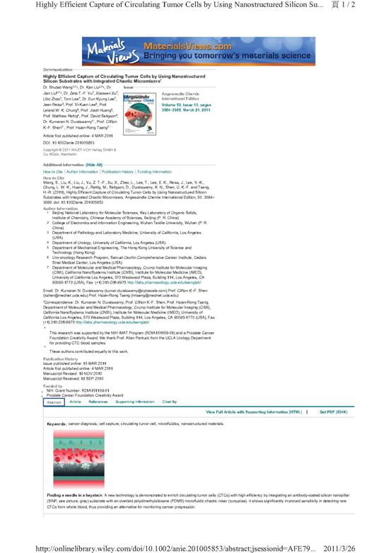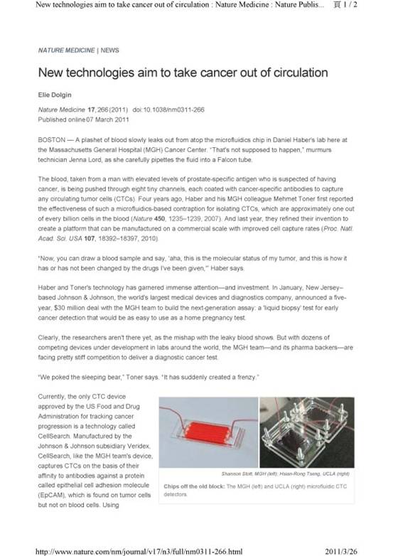 近日,公司新聘的兼职教授的李贻昆教授(来自香港科技大学,是美国加州大学博士UCLA)及其科研小组研发的MEMS微机电生物测癌芯片microfluidic CTC chip paper for early cancer diagnostics已被刊登国际医学权威期刊封面,并被国际权威医学杂志medical Nature 3/21期报导,此荣誉与诺贝尔奖相当。