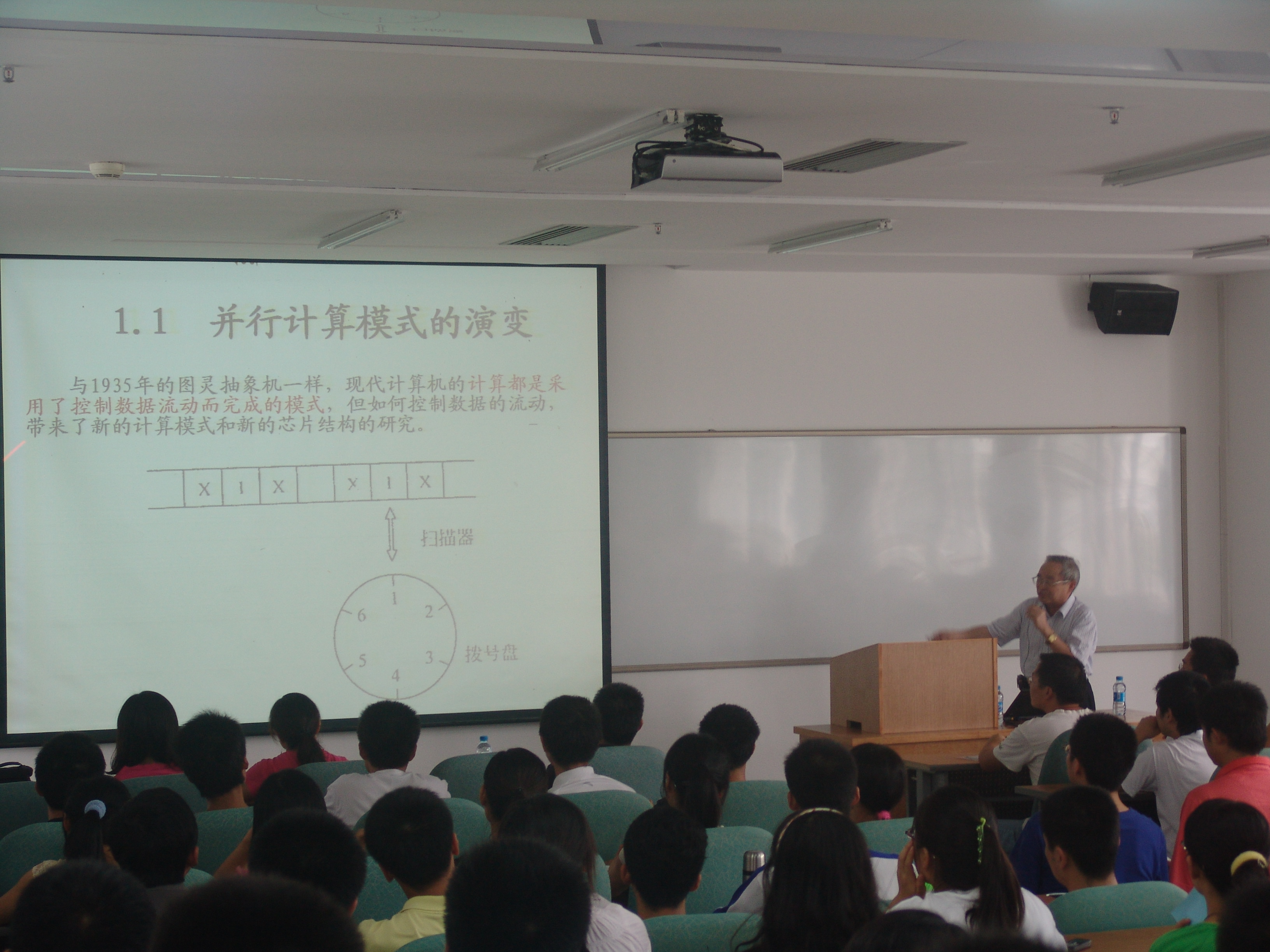 9月10日下午,应王新安教授邀请,中国科公司沈绪榜院士来访公司,并面向全院师生做了题为“知识社会的芯片技术演变”的讲座。此次讲座吸引了很多师生的积极参与,C203教室座无虚席。沈绪榜院士是我国著名的计算机专家,曾研制出我国第一台国产双极小规模集成电路航天制导计算机,领导和指导了我国多种航天计算机和计算机芯片的研制。此次讲座,沈院士首先提出,计算机技术推进人类快速进入了知识社会的时代特征,接着就从芯片的设计,制作,封装测试,以及应用等四个方面对芯片的现状和发展方向做了详细的介绍,并结合国际芯片技术发展的趋势及特点提出了未来可竞争的关键技术领域。同学们聚精会神地听讲,并在最后的提问环节就阵列处理器、SOC(系统芯片)等技术问题和沈院士进行了讨论。