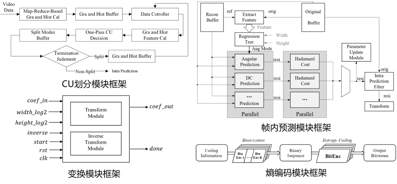 论文2:“OpenHardwareVC: An Open Source Library for 8K UHD Video Coding Hardware Implementation”主要用于应对具有我国自主知识产权的新一代音视频编码标准(AVS3,The Third-generation Audio Video Coding Standard)在硬件平台上实现8K(7680Í4320)超高清实时编码的挑战。8K超高清视频在硬件平台上的实时压缩是视频编码新标准的示范性应用。然而,新一代音视频编码标准AVS3中加入的众多编码工具大大增加了编码复杂性,严重阻碍了硬件编码器的高效实现。为了打破瓶颈,该文章提出了第一个用于8K超高清视频编码硬件实现的开源软件库OpenHardwareVC。基于对AVS3软件算法的分析,此库中提供了四个主要编码阶段的硬件加速设计,包括编码单元分区、内部预测、变换和熵编码。硬件仿真结果表明,基于该库中的软件描述模块可以轻松支持8K视频每秒30帧的实时压缩。该算法库的研发对超高清视频编码的硬件设计和系统实现具有重大意义,也有利于新编码标准的推广。目前OpenHardwareVC算法库已开源在OpenI启智社区https://git.openi.org.cn/OpenHardwareVC。该论文通讯作者为高伟助理教授,WilliamHill中文官网入口为第一作者单位,AVS3hi 8K硬件FPGA项目组全体同学为共同作者(包括:博士生袁航、硕士生郭洋、硕士生陶履方和硕士生蔡占元等),合作者还包括WilliamHill中文官网入口李革教授。