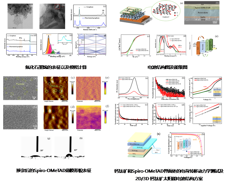 近日,公司周航课题组(https://zhouapril.com/)在能源材料领域期刊《Advanced Energy Materials》(IF=29.698)上发表了题为“Enhanced Efficiency and Stability of n-i-p Perovskite Solar Cells by Incorporation of Fluorinated Graphene in the Spiro-OMeTAD Hole Transport Layer”的研究论文(DOI: 10.1002/aenm.202201344)。该工作提出将氟化石墨烯 (Fluorinated Graphene,FG) 作为有机空穴传输层材料Spiro-OMeTAD的多功能P型添加剂,所制备的器件光电转换效率和开路电压分别达到23.14%和1.226,这是迄今为止该体系报道的最高效率值和最高开路电压值之一。