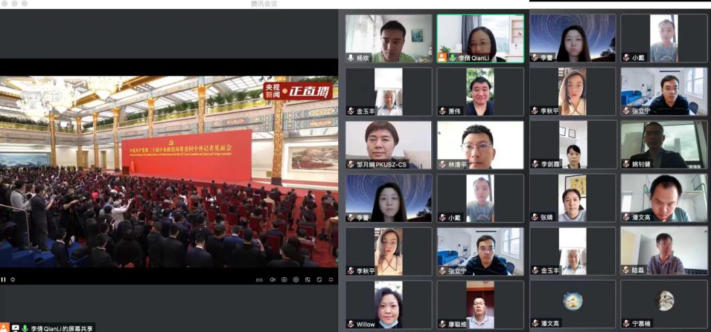 2022年10月23日中午,信工公司教工与员工支部党员共计43人在线上/线下集中观看第二十届中共中央政治局常委同中外记者见面会直播。线上会议由教工支部书记李倩和2022微电子员工支部书记赵佳佳主持。