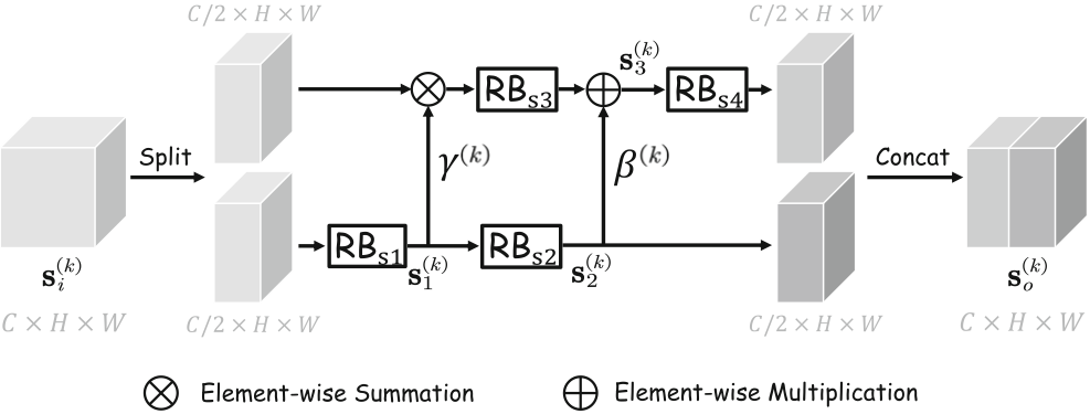 在stage内部,本文中提出了自调制模块 (SMB), 如图2所示。SMB可以自适应地生成仿射变换参数,从而进行元素级特征调制。SMB 在没有增加模型参数的情况下,增大了感受野,使得网络在stage内部高效地提取到更丰富的特征信息。