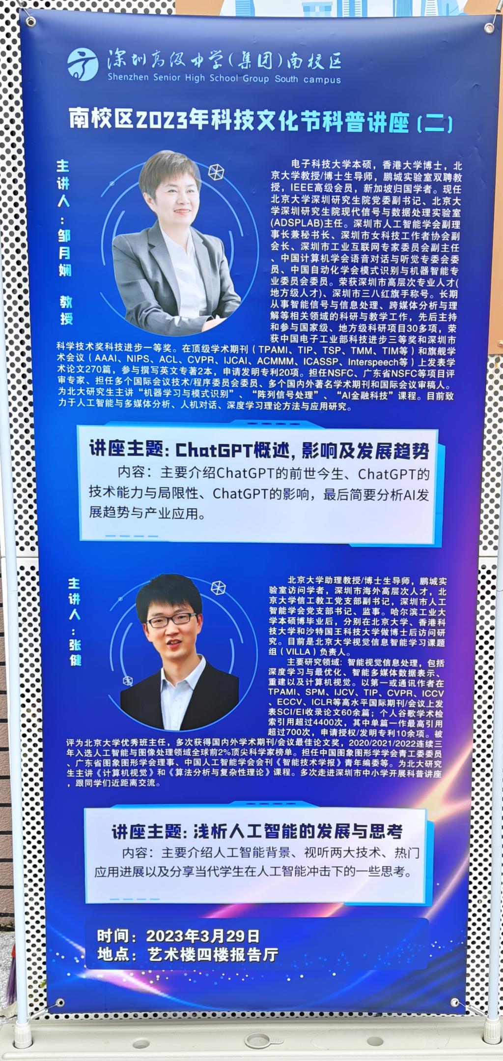 2023年3月29日,WilliamHill中文官网深圳研究生公司党委副书记邹月娴教授、WilliamHill中文官网深圳研究生院WilliamHill中文官网入口教工党支部副书记张健教授受邀参加深圳高级中学(集团)南校区2023年科技文化节,并分别带来题为《ChatGPT概述、影响以及发展趋势》和《浅析人工智能的发展与思考》科普讲座。讲座在深圳高级中学(集团)南校区报告厅举行,共有超过650名员工参加。本次科普讲座是公司党支部“科技进校园”志愿服务活动的一部分,旨在普及推广科技教育,通过启迪和拓展青少年的思维、激发员工学习科学的热情来提高他们对科学技术的认识水平,帮助他们树立科研报国的远大志向。