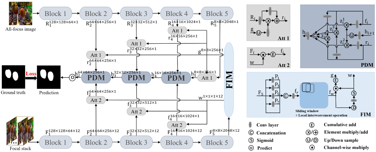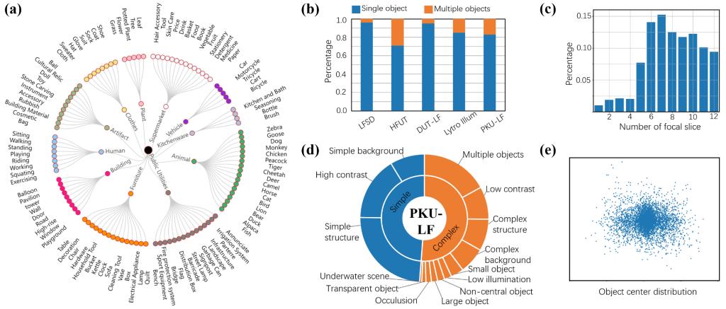论文2:“A Thorough Benchmark and A New Model for Light Field Saliency Detection”重点讨论了基于光场的图像分割的数据集和相关技术。与现有的RGB或者RGB-D显著性检测数据集相比,用于光场显著性检测的数据集往往存在数据量多样性不足、数据格式不完整、标签粗糙等诸多缺陷,从而阻碍了该领域的发展。为了解决这些问题,我们精心构建了一个名为PKU-LF的大规模光场数据集,它包含了5000个光场样本,涵盖了各种室内外场景。我们的PKU-LF提供了包罗万象的光场数据格式,并提供了一个统一的平台来比较使用了不同光场格式的算法。为了激发显著性目标检测任务的新活力,我们提拱了许多未被探究的场景(例如水下和高分辨率场景)和最丰富的标注(例如涂鸦标注、边界框、对象/实例级标注和边缘标注),基于这些数据可以研究许多潜在的注意力建模任务。为了促进显著性检测任务的发展,我们在四个现有数据集以及所提出的数据集上系统地评估和分析了16种具有代表性的2D、3D和4D方法,提供了一个全面的基准。此外,针对光场的独特结构特征,我们提出了一种新颖的对称双流架构网络以更准确地预测光场的显著性。具体来说,我们的模型包含了焦点交织模块和三个部分解码器模块。前者旨在有效地建立跨焦点切片的长距离依赖,而后者旨在以相互增强的方式有效地聚合提取的特征。大量实验表明我们的方法明显优于已有的方法。项目开源地址:https://openi.pcl.ac.cn/OpenDatasets。