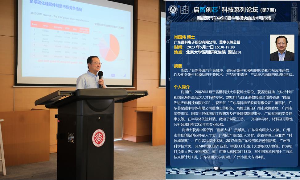 肖国伟博士从创业和科技产业化的角度进行了精彩的分享。他重点介绍了在新能源汽车领域中,碳化硅器件和模块的优势以及市场应用趋势,并深入探讨了相关技术产品的主要应用情况。他向在场的老师和同学们详细介绍了晶科电子在该领域的技术积累和战略布局,为大家展示了公司在该领域的所做的努力。此外,肖博士也提到了碳化硅技术在产品开发和应用中所面临的机遇和挑战,为与会者们提供了宝贵的学术和创业思路。肖博士还结合自己的亲身经历,跟大家分享了从科研到技术再到产业化的发展和转化历程以及宝贵经验。