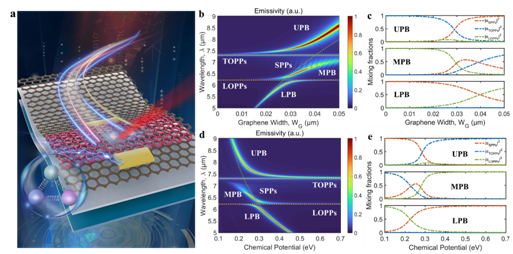 热辐射是自然界中一种基本的光发射现象,根据普朗克定律,任何非零温度的物体都会产生热辐射,传统黑体辐射具有各向同性、宽带、非相干和非偏振的特点。在近十年中,利用纳米结构材料在精确控制热辐射光谱、方向性、偏振和时间响应等方面取得相当大的进展。如今,光谱可调热辐射已经在热成像、温度调节和太阳能收集方面具有丰富应用。目前,利用石墨烯和六方氮化硼(hBN)材料设计可调谐热辐射器件是一个研究热点。石墨烯表面等离激元(SPPs)具有局域化程度高、损耗低、支持电调制以及吸收带隙达到中红外波段等的优点。与此同时,hBN材料支持双曲声子极化激元,其中电子屏蔽和库仑相互作用导致声子模式分离为纵向光学声子模式(LOPPs)和横向光学声子模式(TOPPs)。使用等离激元-声子强耦合来增加多个波长通道的想法已在增强近场辐射传热(NFRHT)实验中得到证实。然而,这些工作主要集中于评估强耦合对NFRHT的影响,很少讨论耦合过程中能量交换和模式杂化问题。近年来,hBN原子层材料已被证明其峰值辐射率有望与hBN块状材料一样高,因此建立石墨烯/hBN原子系统有利于进一步缩小热辐射器件的体积,且所得的强耦合杂化态也会表现出欧姆损耗小和品质因数高的突出特点。