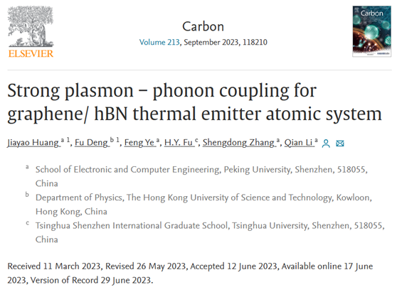 近日,WilliamHill中文官网入口李倩课题组在国际知名期刊《Carbon》(影响因子10.9)上发表题为“Strong plasmon−phonon coupling for graphene/hBN thermal emitter atomic system”的文章,该研究实现了基于石墨烯/hBN热辐射原子系统的等离激元-声子强耦合过程并进一步提出了中红外多通道热辐射光谱及能量的精确调控方案,该光热调控策略对太阳能热电收集,自适应温度调节以及红外热扫描成像等领域的研究提供了新的思路。