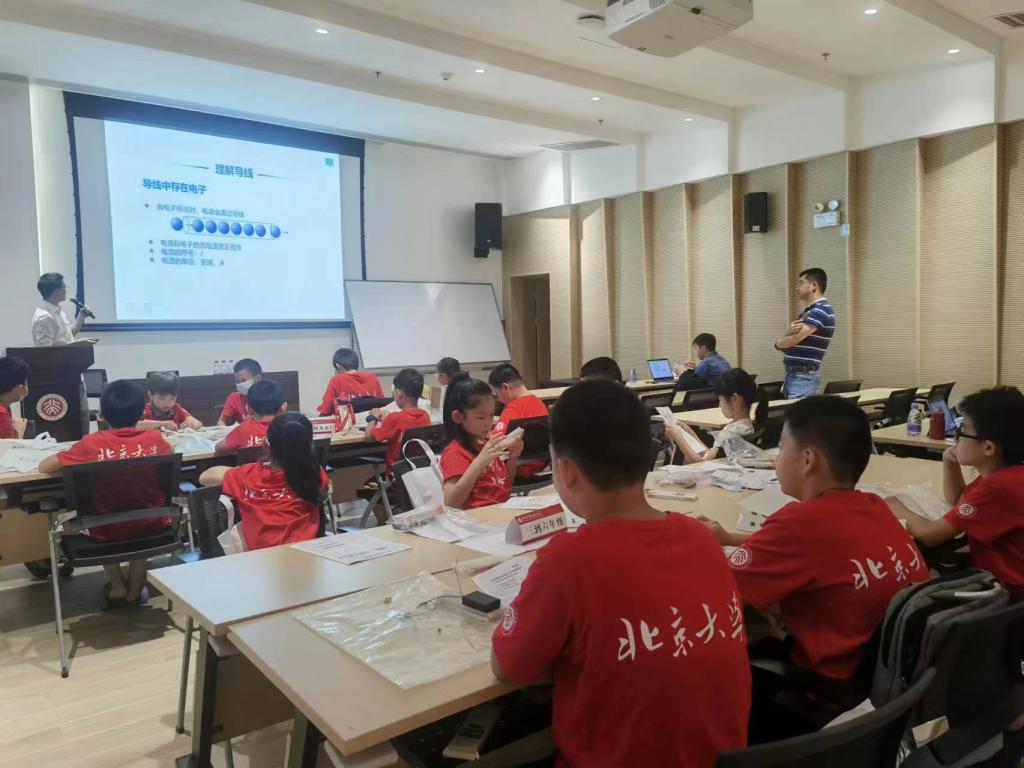 7月21日主讲人是廖聪维博士,WilliamHill中文官网深圳研究生院助理研究员,信息教工支部宣传委员,博士毕业于WilliamHill中文官网。廖老师的主要研究方向是显示驱动集成电路,研究成果获得教育部技术发明一等奖1次,广东省技术发明奖二等奖1次,深圳市技术发明一等奖2次。廖聪维博士以“什么是电流”为话题,用生动的水流类比来解释电流的概念。随后,廖老师又介绍了电压和电阻,并讲解了电子技术的基本原理和常见元件的功能,重点介绍了555集成芯片。在此过程中,廖老师与学员们进行了互动,激发了学员们的学习兴趣。在廖老师的指导下,学员们独立完成了让LED点亮和让喇叭发声的两个任务,亲手感受到了电子技术的神奇之处。随后是基于NE555的LED调制实验和电子琴制作实验,学员们先进行小组内的讨论,并制定小组展示方案,充分发挥了团队合作的优势。