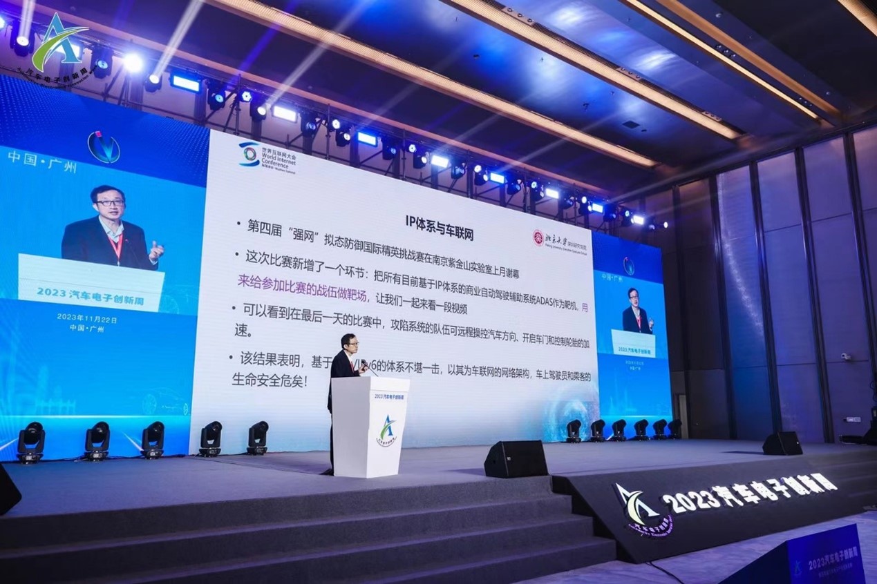 李挥教授的演讲主题为《人类网络空间命运共同体架构体系MIN及在智能网联汽车的应用》。他指出,IP网络三大致命缺陷,一是网络空间被独家垄断,二是没有安全基因事故层出不穷,三是架构僵化演进升级成本巨大。