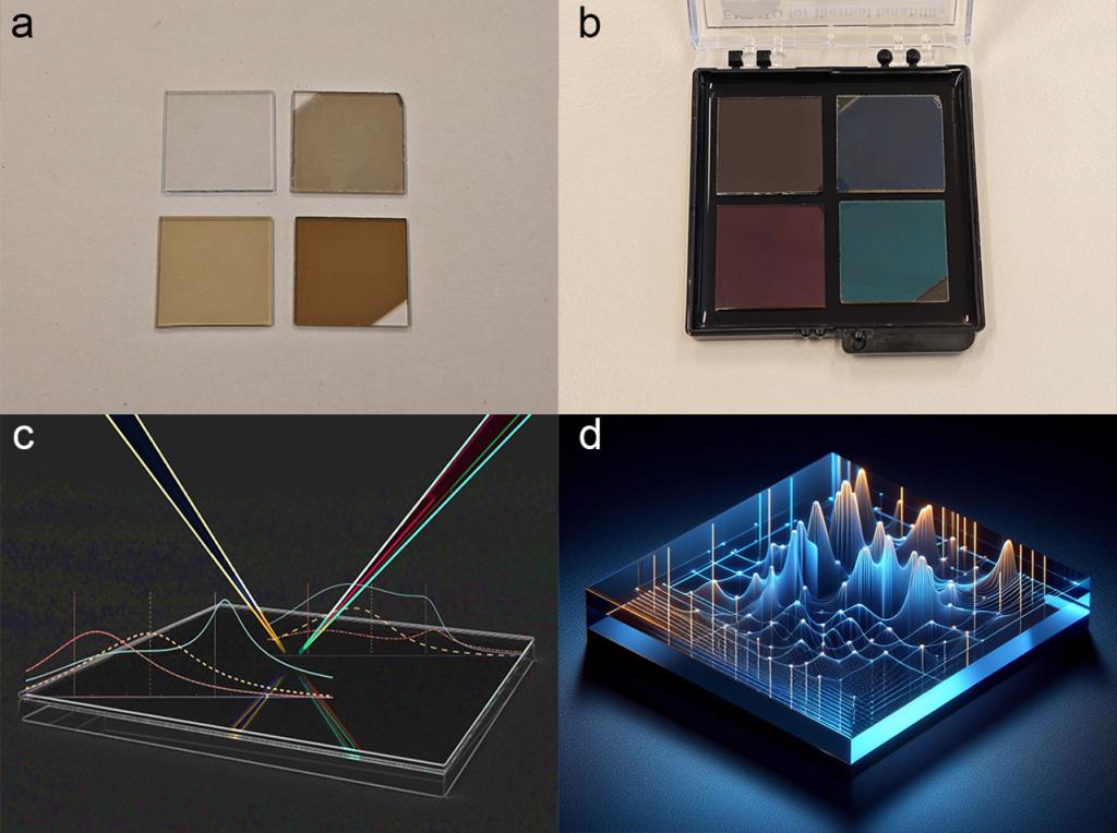 图1. (a, b) 三个主流红外通信波段的ENZ氧化铟锡样品;(c) 椭偏仪测量下的样品产生线性与非线性热光效应的艺术化呈现;(d) 集成器件中的光操控和信息流处理示意图。