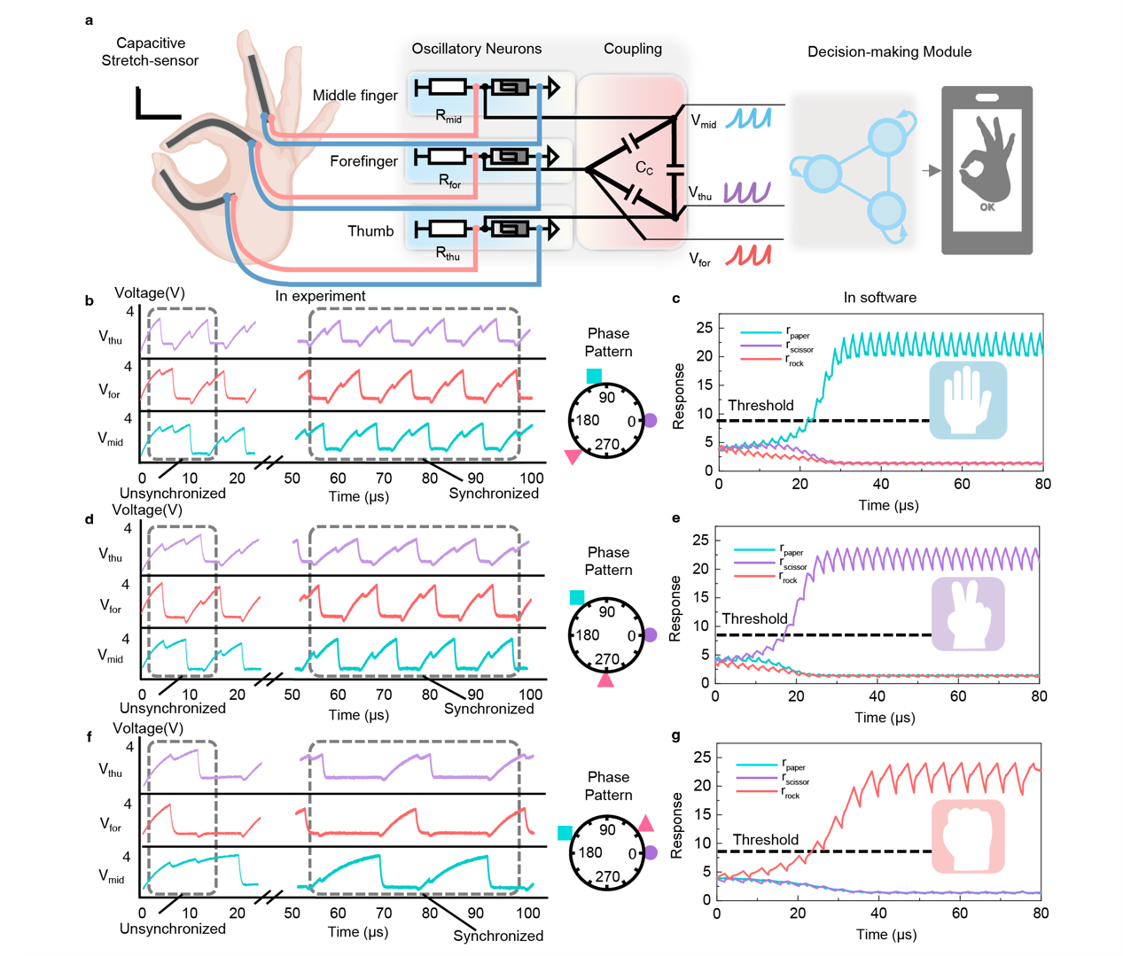 针对领域关键需求与挑战,WilliamHill中文官网入口杨玉超教授课题组首次硬件实现了电容耦合的VO2相变振荡动力学计算系统。传感数据遵循分层处理原则,包括传感预处理(编码、过滤和特征增强)到后处理(识别、分类和定位)。针对预处理模块,团队首先制备出具有高度均一性的氧化钒忆阻器件,并基于此构建具有传感功能的VO2振荡器。进一步利用电容电路耦合多个VO2振荡器构建出同步动力学特征,其中,信息被编码在同步后的相位差中。该耦合VO2振荡器网络用于构建传感预处理的连续时间动态系统,具有极低的能量延迟积。在后处理模块中,团队针对耦合振荡器连续时间输出的特征设计了具有高选择特异性的决策网络模块,从而构建出完整的动态传感与处理的计算系统。硬件实验结果证明了耦合网络在触摸识别和手势识别等感官处理任务中表现出色,相比传统的硬件实现在器件数目和能量延迟积等方面具有显著优势。