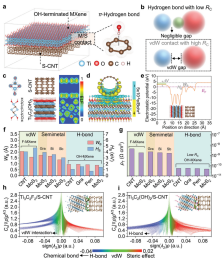 着手调节金属与半导体接触间的基本相互作用是克服高接触电阻的本质途径。这项研究通过第一性原理计算揭示了相比范德华力,氢键可显著增强电子的隧道效应且未引入金属诱导的间隙态,有望实现逼近量子极限的接触电阻,从而为保持清洁接触界面的同时克服范德华集成的限制提供了一个通用途径。通过利用低温全溶液方法,作者在表面工程化的MXene/碳纳米管金半异质结中首次实现了π-氢键接触,并在此基础上实现了高性能柔性薄膜晶体管。该工作通过变温FTIR及电学测量等联合表征了金半接触中氢键存在的证据,并阐明了温度负依赖的隧穿电阻这一反常现象的基本物理机制,最终实现氢键接触电阻值比对应范德华接触低一个数量级。氢键集成的晶体管不仅具有超高的柔韧性,在弯曲半径低至1.5 mm的情况下可承受十万次以上的弯曲,而且载流子迁移率也比对应的范德华晶体管高一个数量级,为实现超越范德华接触限制的高性能、低功耗柔性电子器件提供了一种可扩展的解决方案。