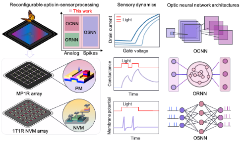 随着机器视觉技术的快速发展,图像传感器在边缘计算中扮演着越来越重要的角色。然而,基于CMOS技术的传统视觉计算系统在实时图像处理方面面临诸多挑战,主要是由于图像传感器、存储器和处理器之间的物理分离导致图像信息处理的延迟和冗余数据的生成。为了解决这些问题,集成了神经形态计算和光图像感知功能的视觉感存算一体系统成为重要的发展方向。但目前视觉感知神经形态器件的动力学特性较为单一,无法实现时空信息编码和脉冲编码功能,且工作方式单一。从硬件系统功能的角度来看,当前的视觉感存算集成阵列主要支持人工神经网络或脉冲神经网络的单一算法,难以兼容不同类型的神经网络算法,因此有必要实现一种既适应仿生又适应机器学习的感存算一体硬件架构,以构建具有可重构性和多类型算法兼容的视觉计算硬件系统。