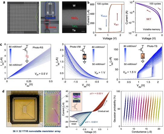 图2.可重构光晶体管-忆阻器集成阵列与1T1R非易失性忆阻器集成阵列