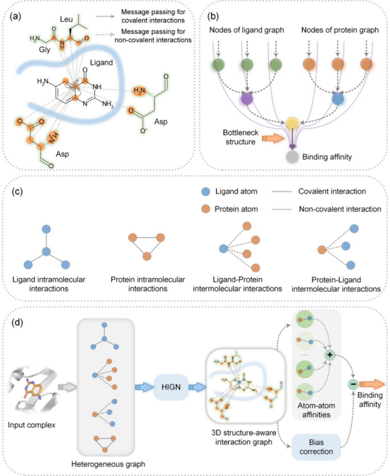 当前,在蛋白质-配体结合亲和力预测研究中,基于相互作用图神经网络(Interaction Graph Neural Network, IGNN)的深度学习打分函数表现出出色的性能和发展潜力。这主要得益于此类模型在蛋白-配体相互作用表征中融入了一定的物理化学归纳偏置,使其有机会学习并捕捉复合物结构中关键的相互作用特征,从而实现几何亲和力的有效预测。然而,许多IGNN模型仍然采用同质图进行表征,这在一定程度上忽略了对配体而言占主导地位的非共价相互作用。在消息传递过程中,该做法弱化了配体分子内部共价键对节点特征更新的影响,从而导致潜在信息的丢失,如图1(a)所示。此外,大多数3D-GNN模型采用“瓶颈”架构:输入的图结构经过多层图卷积后,通常通过全局池化将其压缩为单一向量表征(如图1(b)所示)。然而,这一处理方式可能会使得3D结构信息在压缩过程丢失。针对上述问题,论文提出了一种改进的亲合性打分方法EHIGN。EHIGN采用异质图建模方法(如图1(c)),并将结合亲和力视为蛋白-配体原子间非共价相互作用贡献的加和,再通过偏差校正项对潜在偏差进行校正(如图1(d)),对于模型的泛化能力起到了明显的提升作用,相关成果发表在TPAMI上(https://ieeexplore.ieee.org/abstract/document/10530021)。