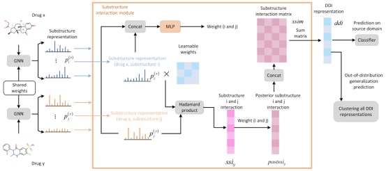 在药物-药物相互作用预测领域,深度学习方法虽然已被广泛应用,但其在跨域泛化方面仍存在较大局限性。针对这一问题,论文提出了一种域不变子结构相互作用学习方法用于预测DDI(DSIL-DDI)。DSIL-DDI将子结构相互作用视为DDI的域不变表示。在使用图神经网络(GNN)提取子结构后,子结构交互模块用于学习领域不变子结构交互模式。对于提出的子结构交互模块,其模拟子结构中属性的交互。为了学习领域不变表示,DSIL-DDI中设计了一个额外的损失函数,可以从不相关的子结构相互作用中去除噪声。对于一对药物,模块会输出DDI表示。该表示包含与此DDI事件对应的最重要的子结构交互模式。将表示提供给分类器以获得此DDI的类别。对于分布外DDI预测,计算陌生域上的DDI表示(无需重新训练),然后按指定数量的类别对这些表示进行聚类。DSIL-DDI的总体架构如图2所示。相关成果发表在TNNLS(https://ieeexplore.ieee.org/abstract/document/10044475)。