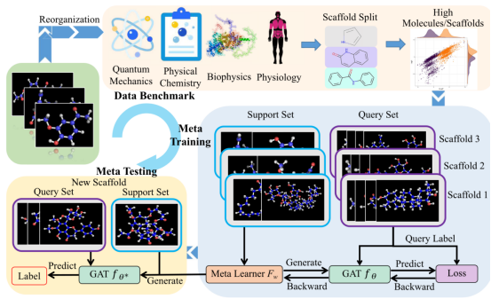 在化合物性质预测领域,深度神经网络在加速与提升药物发现过程方面已取得显著进展。然而,这些技术往往需要大量标注数据,才能对分子特性进行精确预测。现实中,在药物研发初期阶段,对于新型分子或其类似物,相关理化性质与生物活性数据的缺失依然是重大难题。这一困境使得将深度神经网络应用于少样本药物发现面临严峻挑战。为此,论文提出了一种结合图注意力网络(Graph Attention Network, GAT)的元学习框架——Meta-GAT,用以在低数据条件下预测化合物性质,如图3所示。GAT通过三重注意力机制从原子层面捕捉原子团的局部影响,从而有效学习原子团对化合物整体性质的贡献。此外,课题组还构建了一个专用于化合物性质预测的元学习基准数据集(Meta-molnet),如图4所示。相关研究成果已发表在TNNLS(https://ieeexplore.ieee.org/abstract/document/10436119,https://ieeexplore.ieee.org/abstract/document/10059171)。