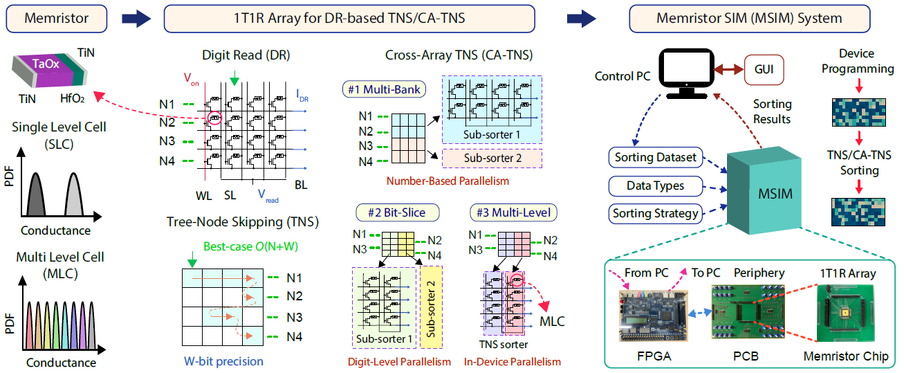 在这项工作中,研究团队首次构建了一个基于1T1R忆阻器阵列、无需比较器的存算一体排序软硬件一体系统。该工作创新的提出了忆阻器阵列位读取(Digit Read)机制,通过并行读取从高位至低位逐步定位当前最小或最大值,配合存算一体电路,彻底颠覆了传统基于比较-选择的排序架构与流程。在此基础上,研究团队进一步提出了树节点跳跃(Tree Node Skipping, TNS)排序算法及其硬件架构,利用遍历路径与信息复用,显著减少了冗余操作,大幅提升了存算一体化排序效率。为应对更加复杂的实际排序应用场景,该工作还设计了三种跨阵列的扩展策略(Cross-array TNS, CA-TNS),分别面向不同并行维度:多阵列(Multi-Bank)策略支持大量数据按数分阵列进行并行处理,位分区(Bit-Slice)策略将位宽拆分到多个阵列实现数字流水并行,多电导(Multi-Level)策略则利用忆阻器的多电导态特性提升单元内并行度,三种创新策略可根据具体排序应用需求灵活配置、组合使用,形成了一套针对可变数据位宽的完整存算一体排序硬件加速方案。