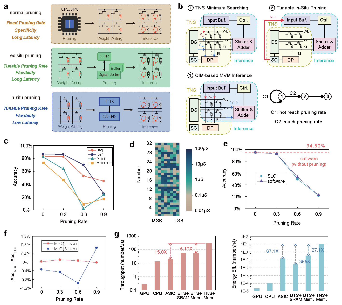 该系统基于实际流片的忆阻器芯片,结合PCB与FPGA搭建了端到端的板卡级应用演示系统,全面验证了其在多种典型排序任务中的优越性能。实验结果显示,相较于当前主流ASIC排序系统,该系统在5类代表性数据集上实现了高达7.70倍的速度提升、160.4倍的能效提升和32.46倍的面积效率提升,充分展现出存算一体架构在大数据排序场景中的巨大潜力。研究团队进一步还将该系统应用于两个实际任务中验证了系统的实用性与通用性:在Dijkstra路径规划应用中,基于TNS排序系统成功实现了北京地铁16个站点之间的最短路径求解,不仅保持运算准确性,还大幅降低延迟和功耗;在神经网络推理中,团队将TNS与忆阻器矩阵向量乘法计算融合,在PointNet++网络上实现了实时原位稀疏(run-time tunable sparsity),可根据推理精度需求灵活控制稀疏度,提升系统效率并同时降低计算开销。相较于传统ASIC排序系统,可以提升15倍的速度和67.1倍的能效。