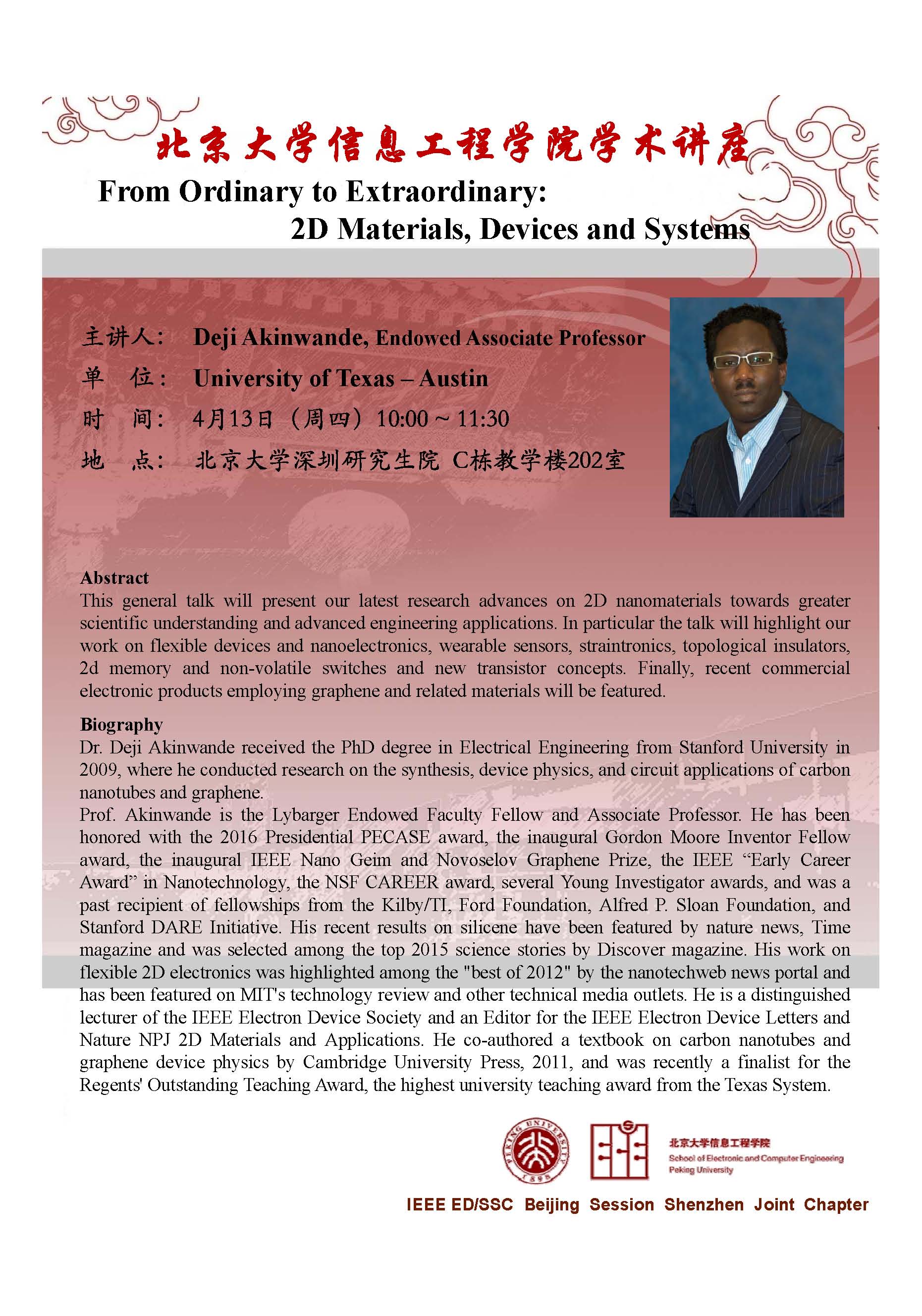 【学术讲座】Associate Professor Deji Akinwande, Endowed ( University of Texas – Austin)From Ordinary to Extraordinary: 2D Materials, Devic