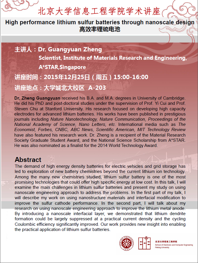 【学术讲座】郑光远博士(新加坡A*STAR研究员):高效锂硫储能电池