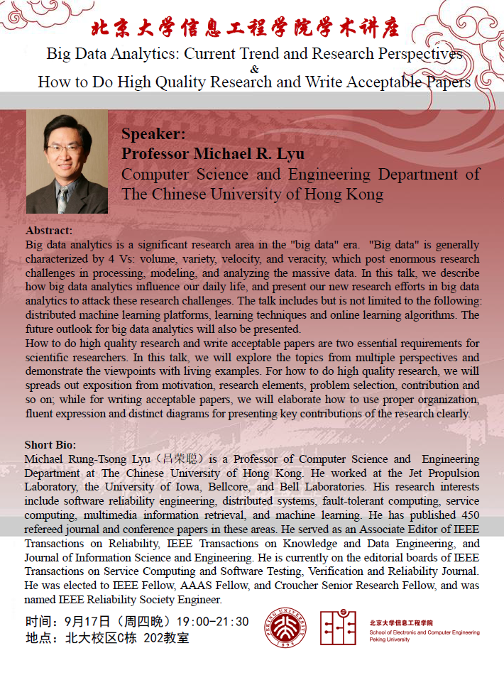 【学术讲座】Professor Michael R. Lyu:Talk 1:Big Data Analytics: Current Trend and Research Perspectives;Talk 2: How To Do High Quality Research