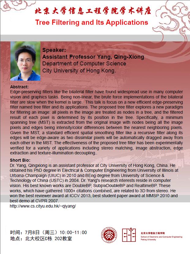 【学术讲座】杨庆雄教授(香港城市大学):Tree Filtering and Its Applications