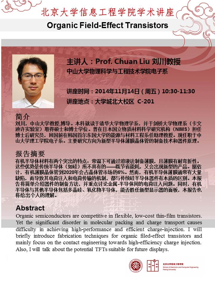【学术讲座】Prof. Chuan Liu:器件制备方法以及金属-半导体间的电荷注入问题