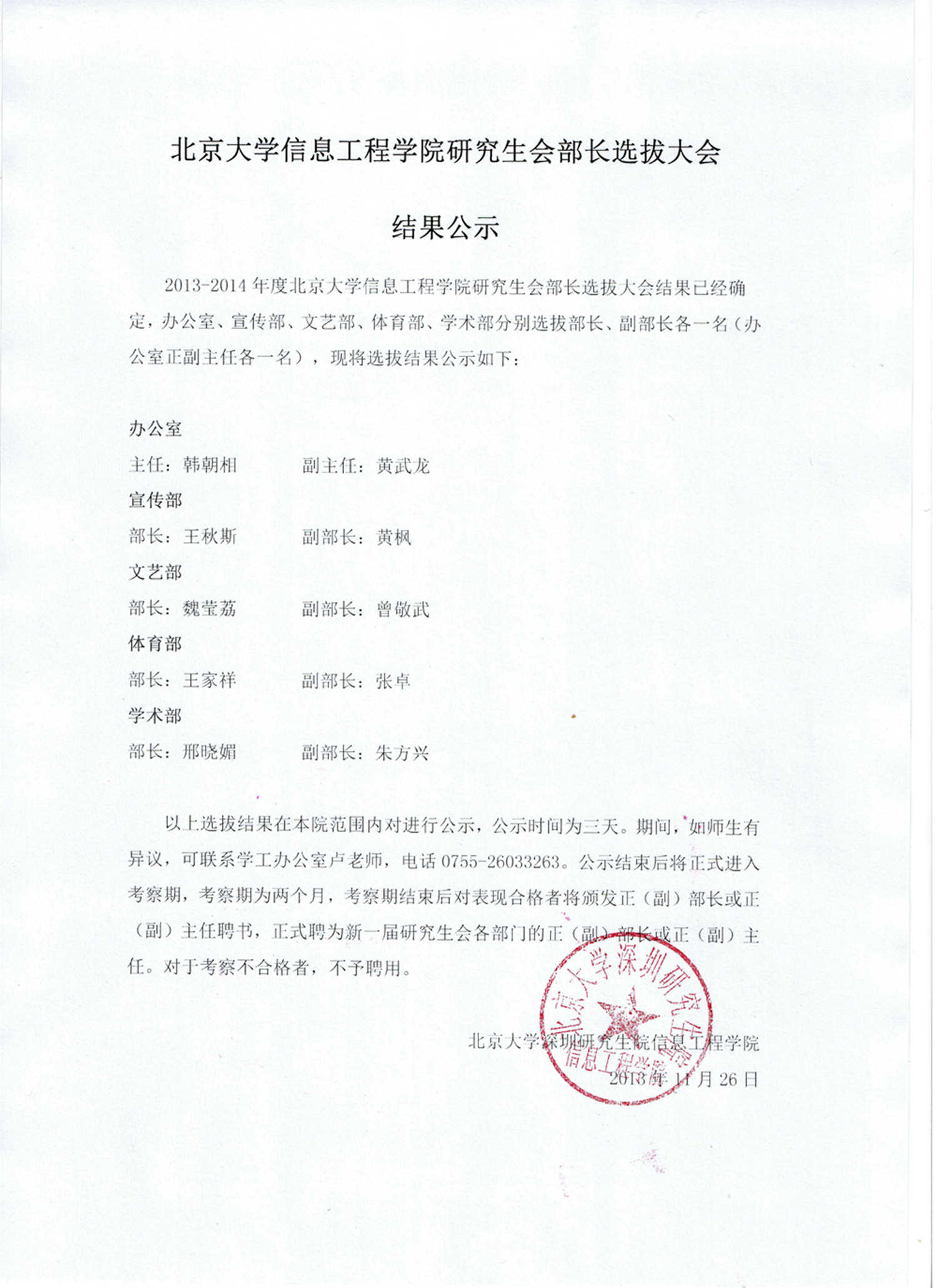2013-2014年度WilliamHill中文官网入口研究生会部长选拔大会结果公示