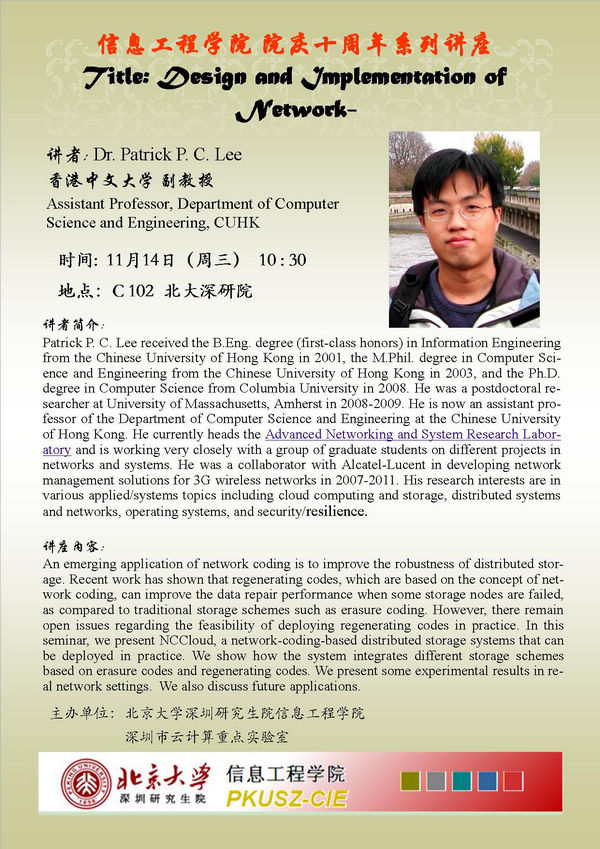 【WilliamHill中文官网入口院庆十周年系列讲座】Dr.Patrick P.C.Lee:Design and Implementation of Network