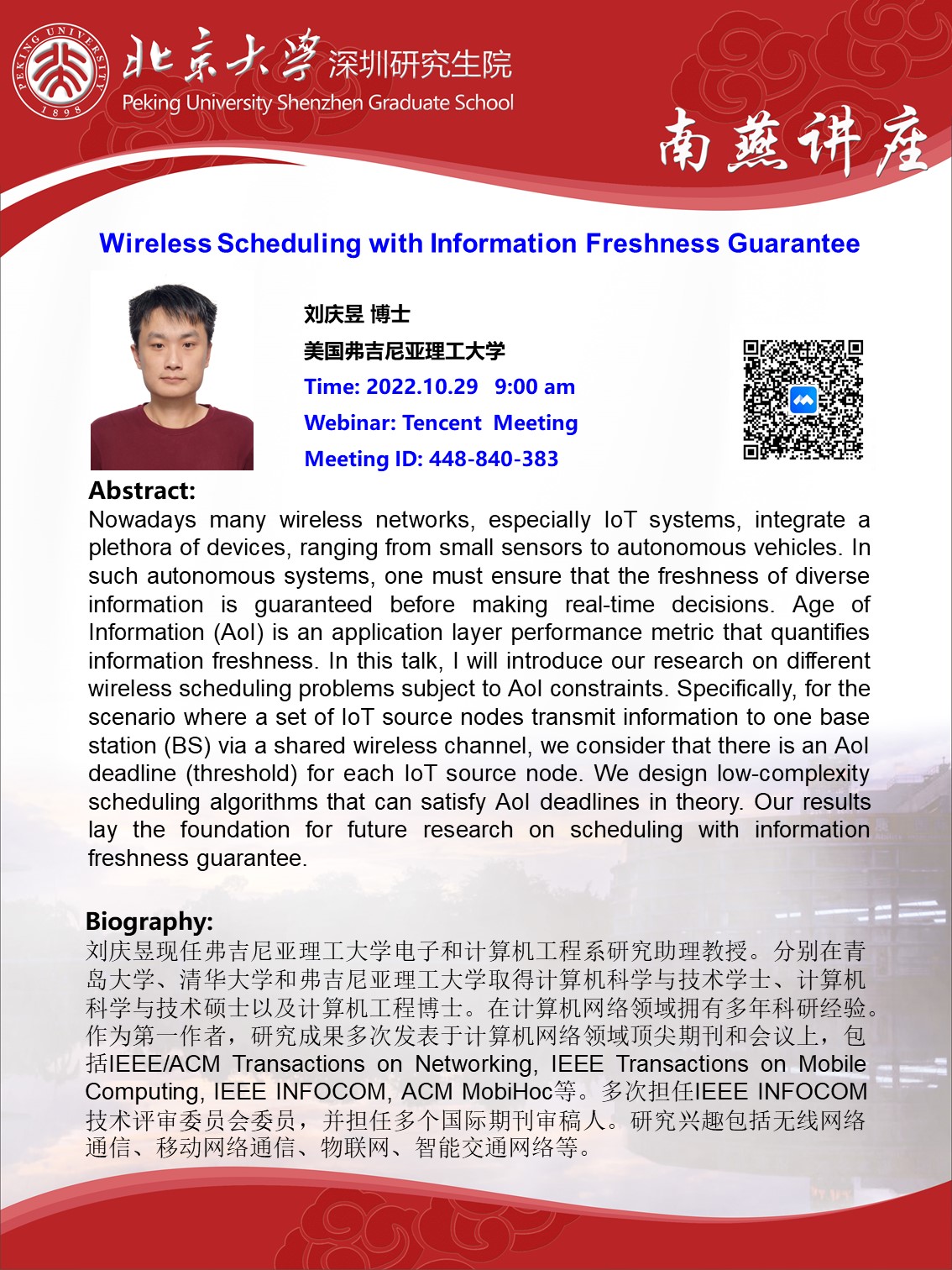 【学术讲座】刘庆昱:Wireless Scheduling with Information Freshness Guarantee