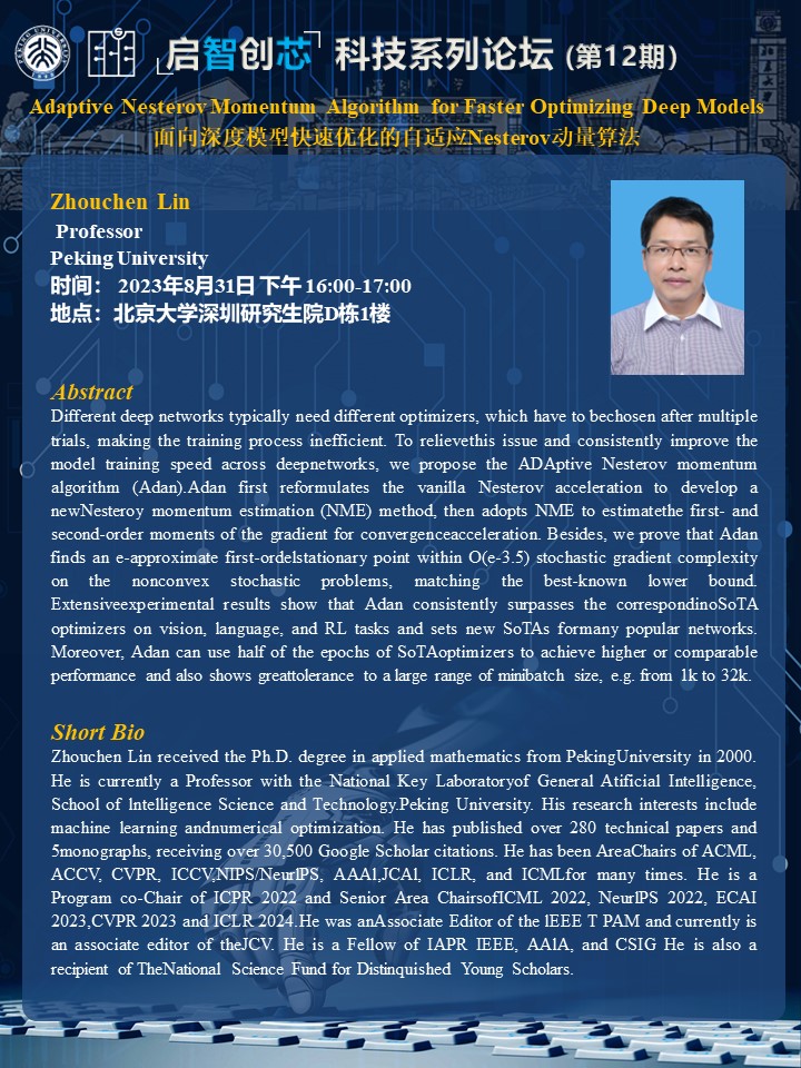 WilliamHill中文官网入口“启智创芯”科技系列论坛系列讲座第十二期定于8月31日(周四)下午16:00-17:00举办,本次论坛在深圳研究生院D栋1楼举行,欢迎广大师生参加。