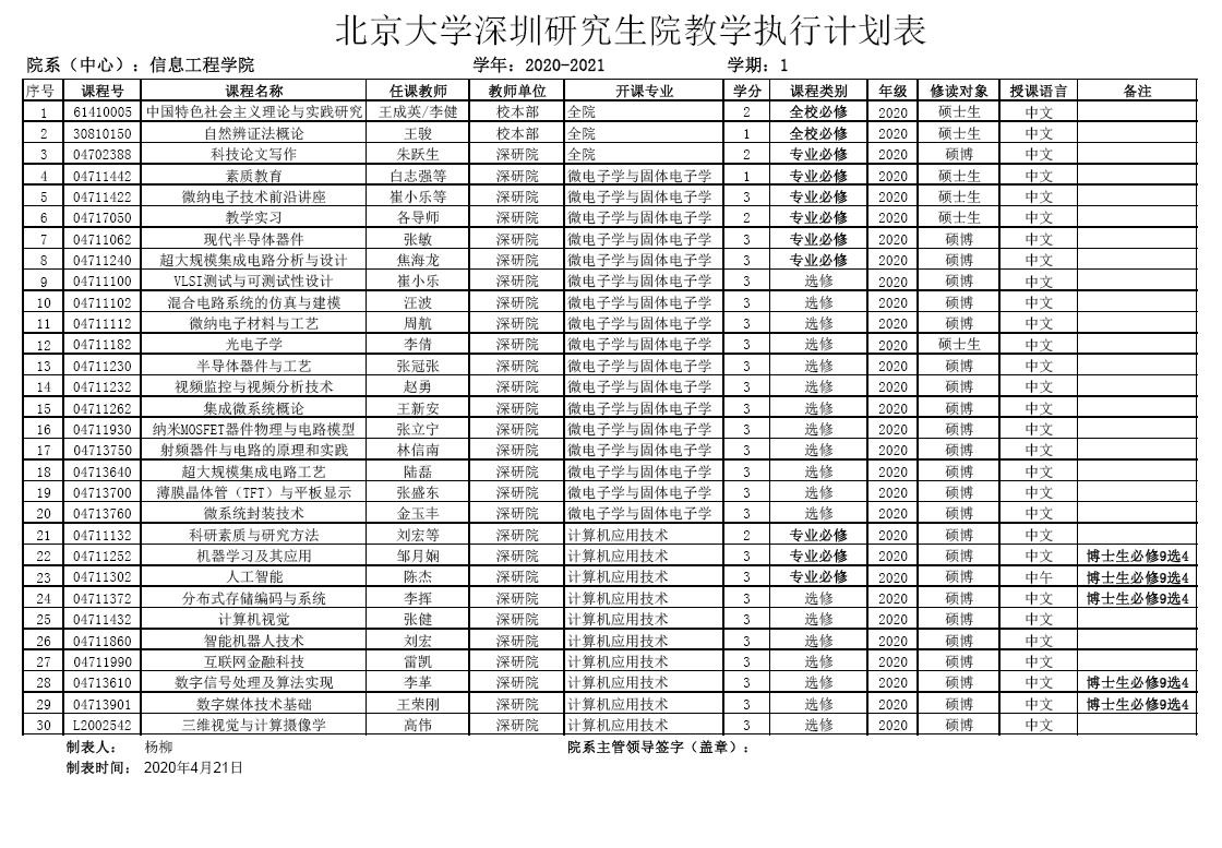 WilliamHill中文官网深圳研究生院2020-2021学年第一学期执行计划
