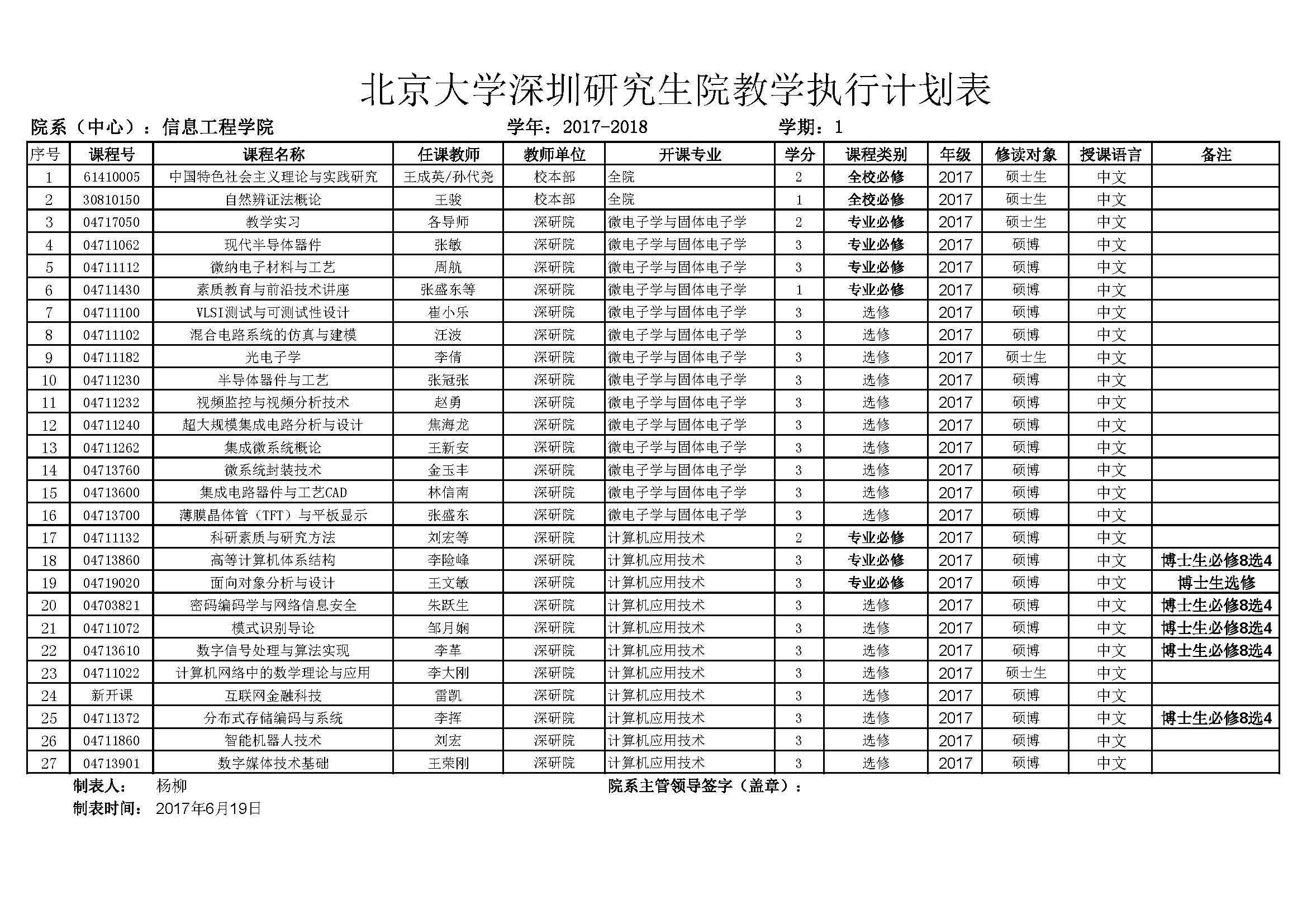 WilliamHill中文官网深圳研究生院2017-2018学年第一学期执行计划