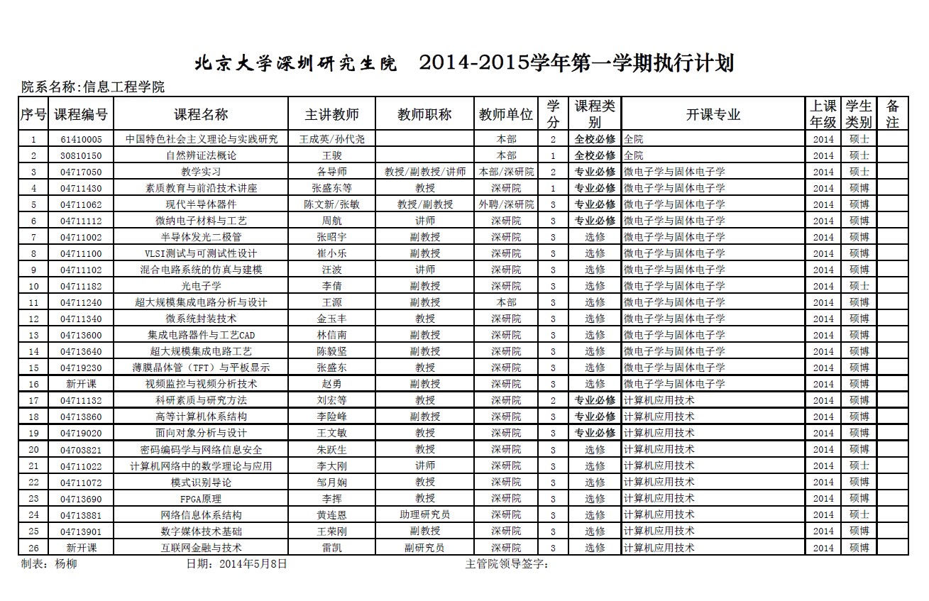 WilliamHill中文官网深圳研究生院2014-2015学年第一学期执行计划